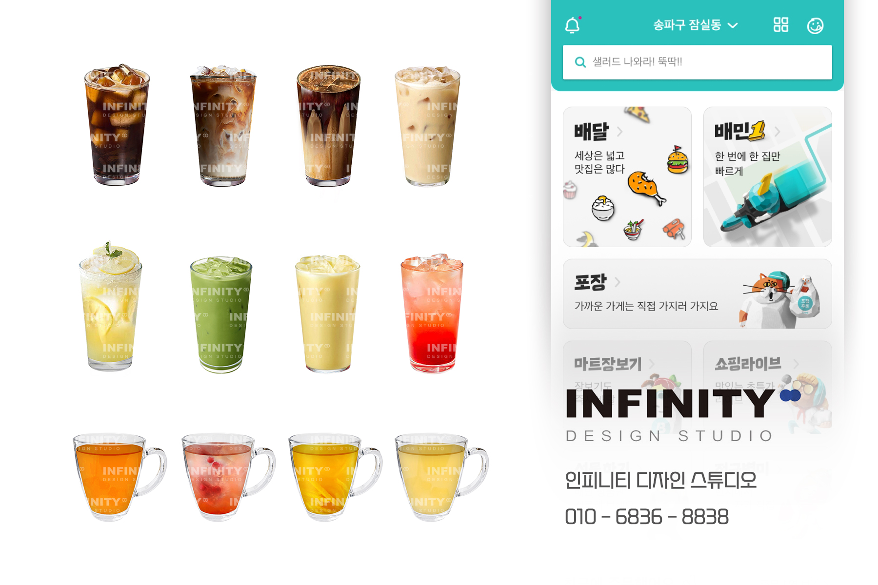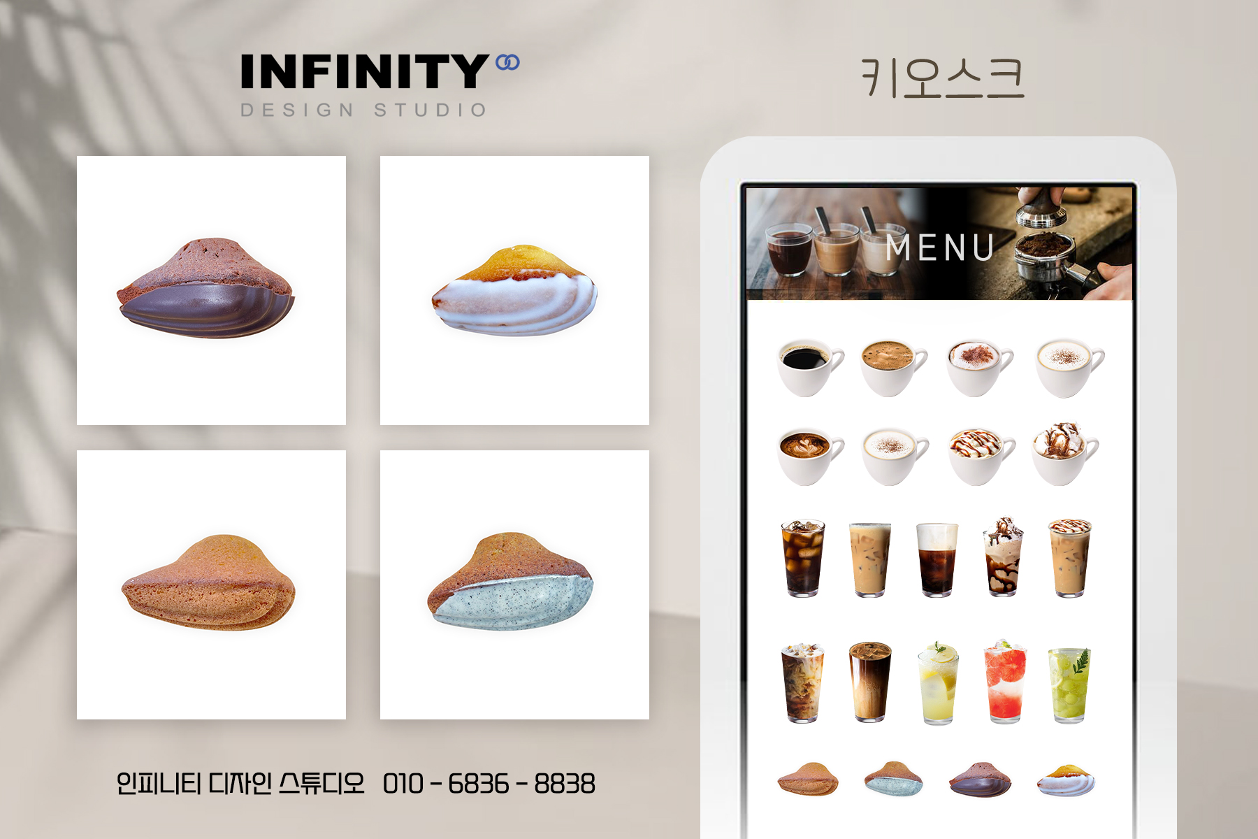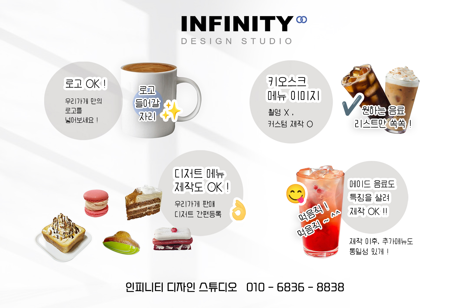 안녕하세요, 카페 홍보물 디자인, 제작 전문 인피니티 디자인 스튜디오 입니다. 우리카페만의 메뉴 이미지 제작! 많은 사장님들께서 만족해주시는 인.기.만.점 !! 키오스크 이미지 제작 서비스