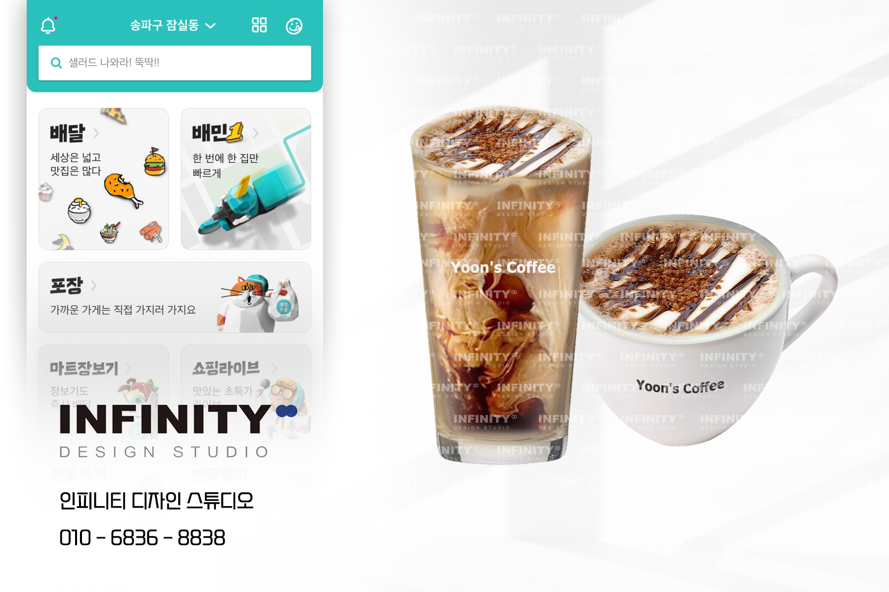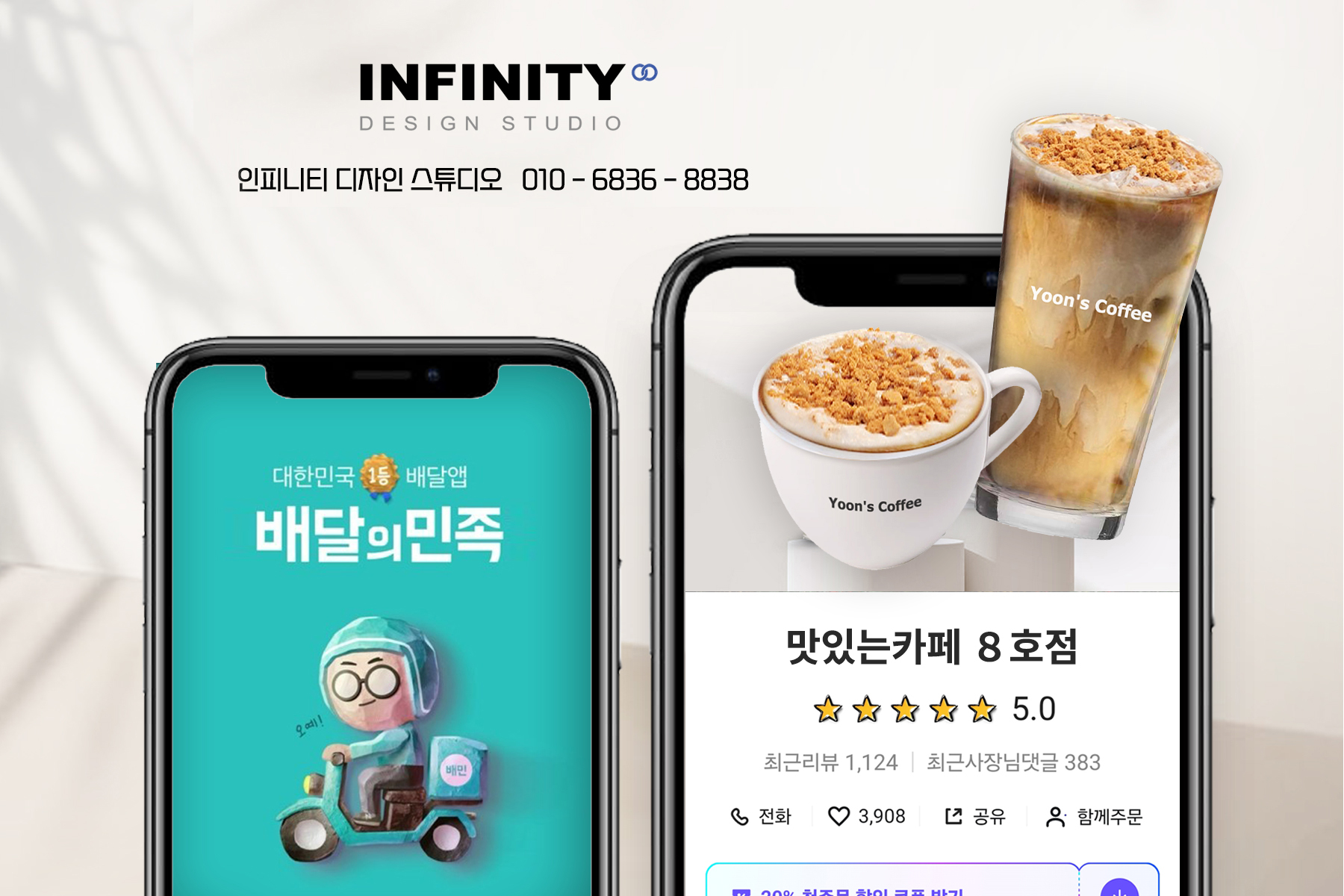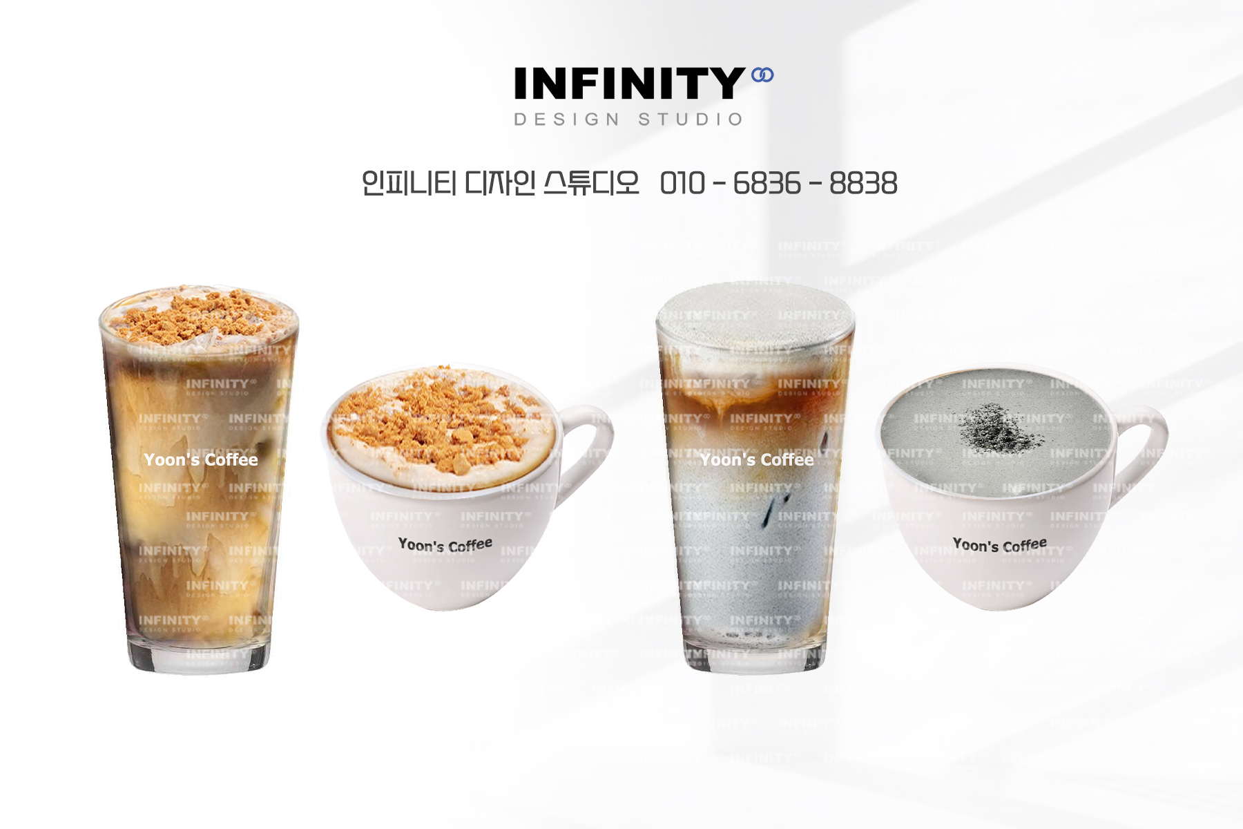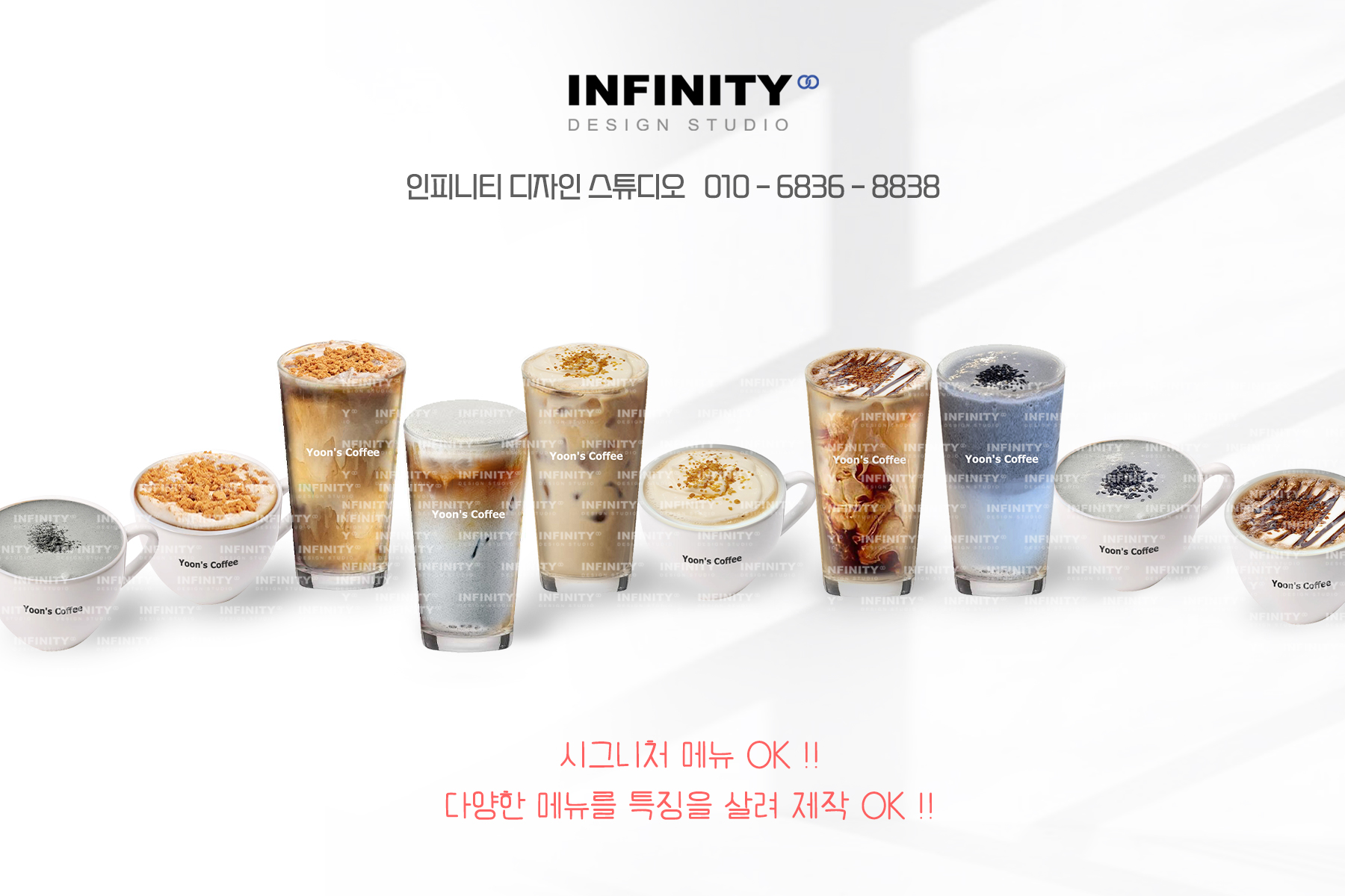 안녕하세요, 카페 홍보물 제작 전문 인피니티 디자인 스튜디오 입니다. 카페 운영중 필요한 품목들 디자인, 제작 필요하시죠? 특히, 배너 / 메뉴판 / 메뉴이미지 촬영 등 카페운영을 위해 필수로