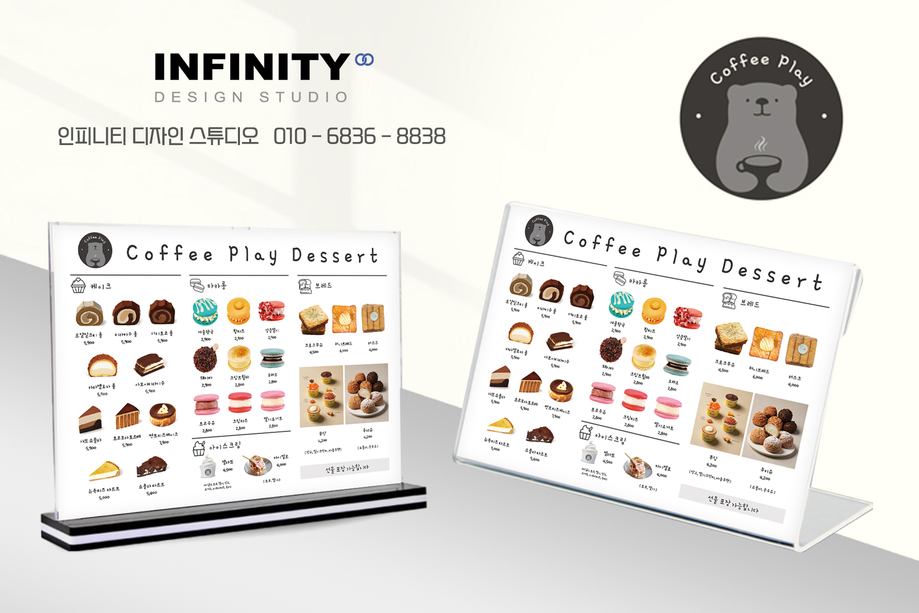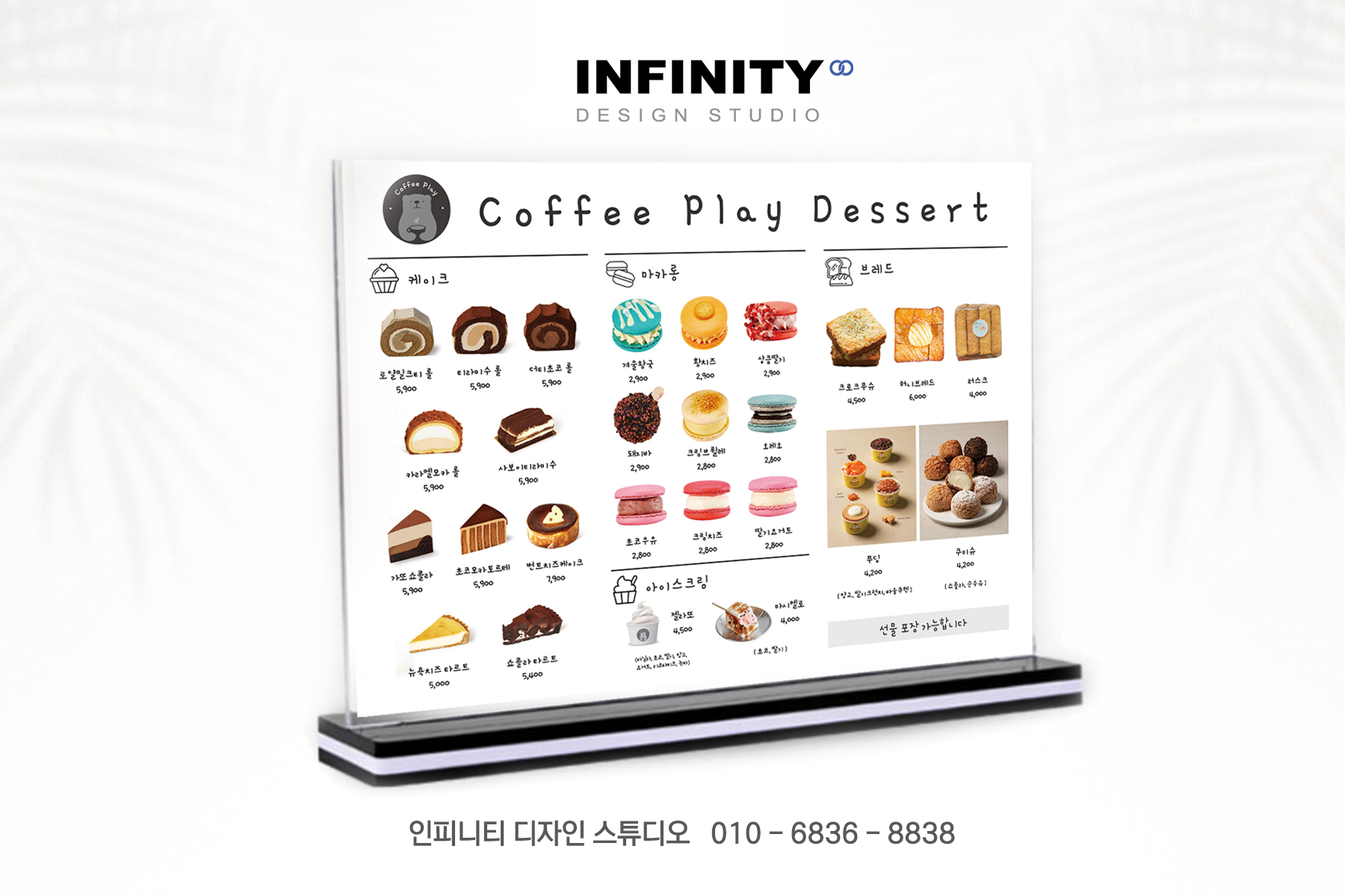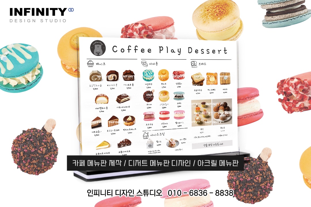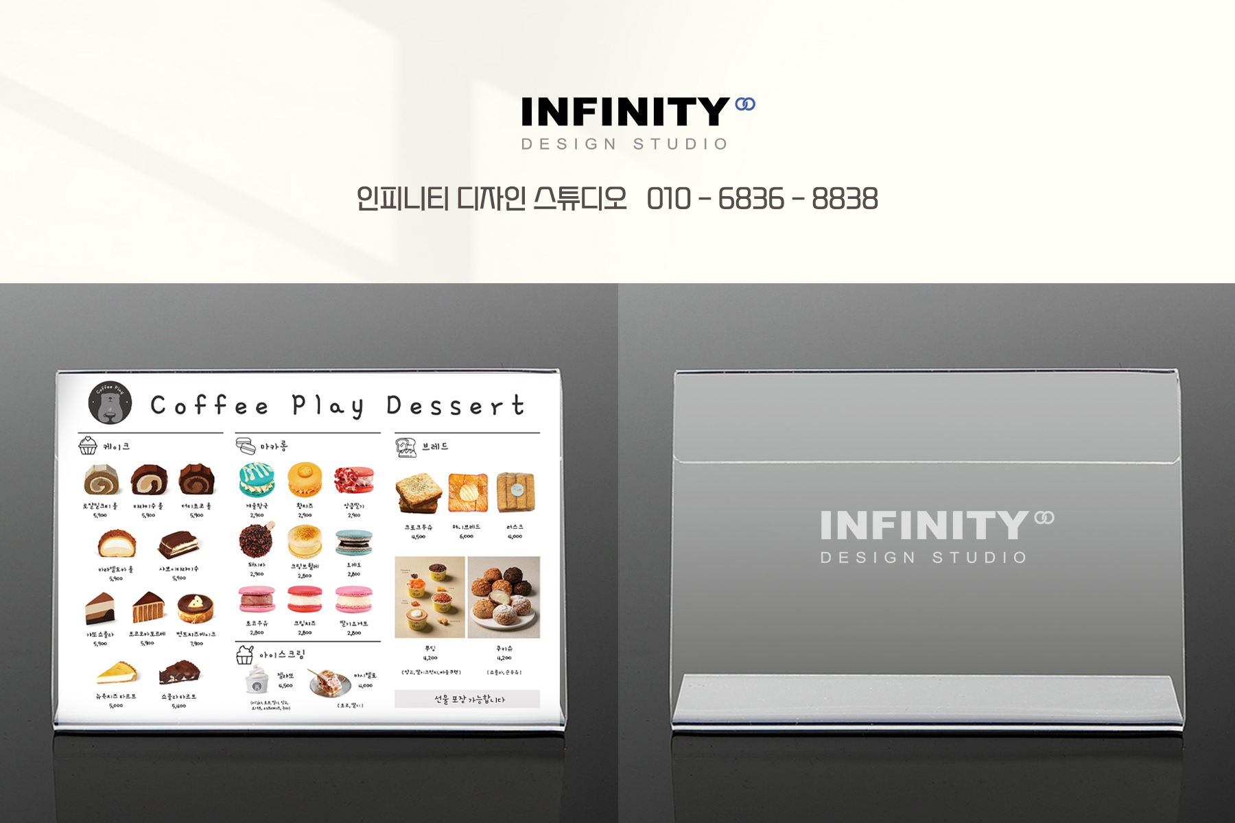 안녕하세요, 카페 홍보물 제작 전문인피니티 디자인 스튜디오 입니다. 카페 메뉴판 추천 소식 포스팅 시작합니다. 카페에서 판매하는 음료와 디저트를 담아아크릴 메뉴판으로 디자인 + 제작