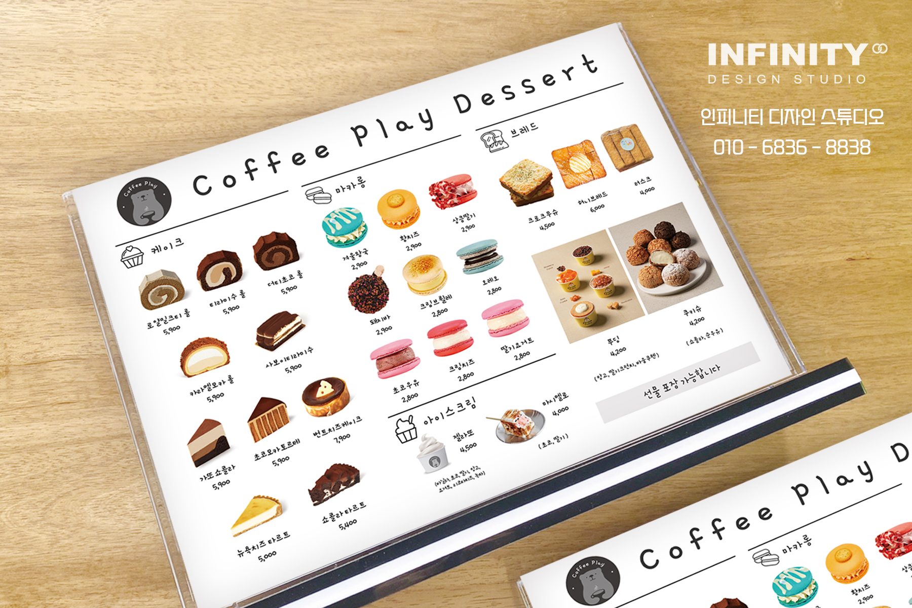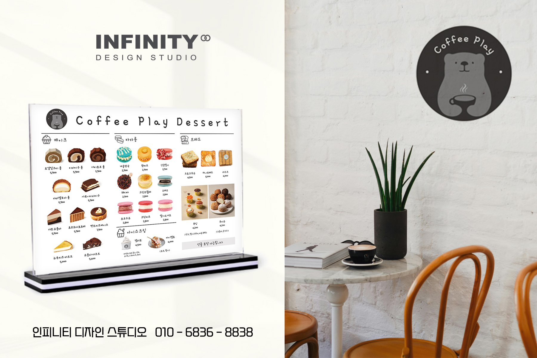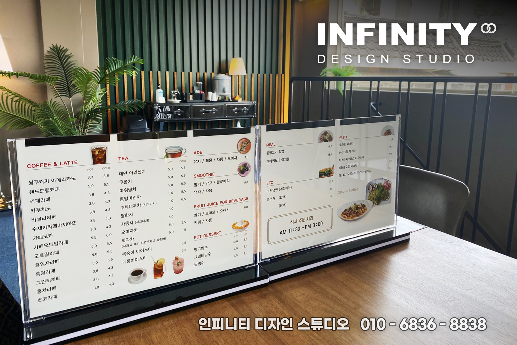 안녕하세요, 카페 홍보물 제작 전문인피니티 디자인 스튜디오 입니다. 카페 메뉴판 추천 소식 포스팅 시작합니다. 카페에서 판매하는 음료와 디저트를 담아아크릴 메뉴판으로 디자인 + 제작
