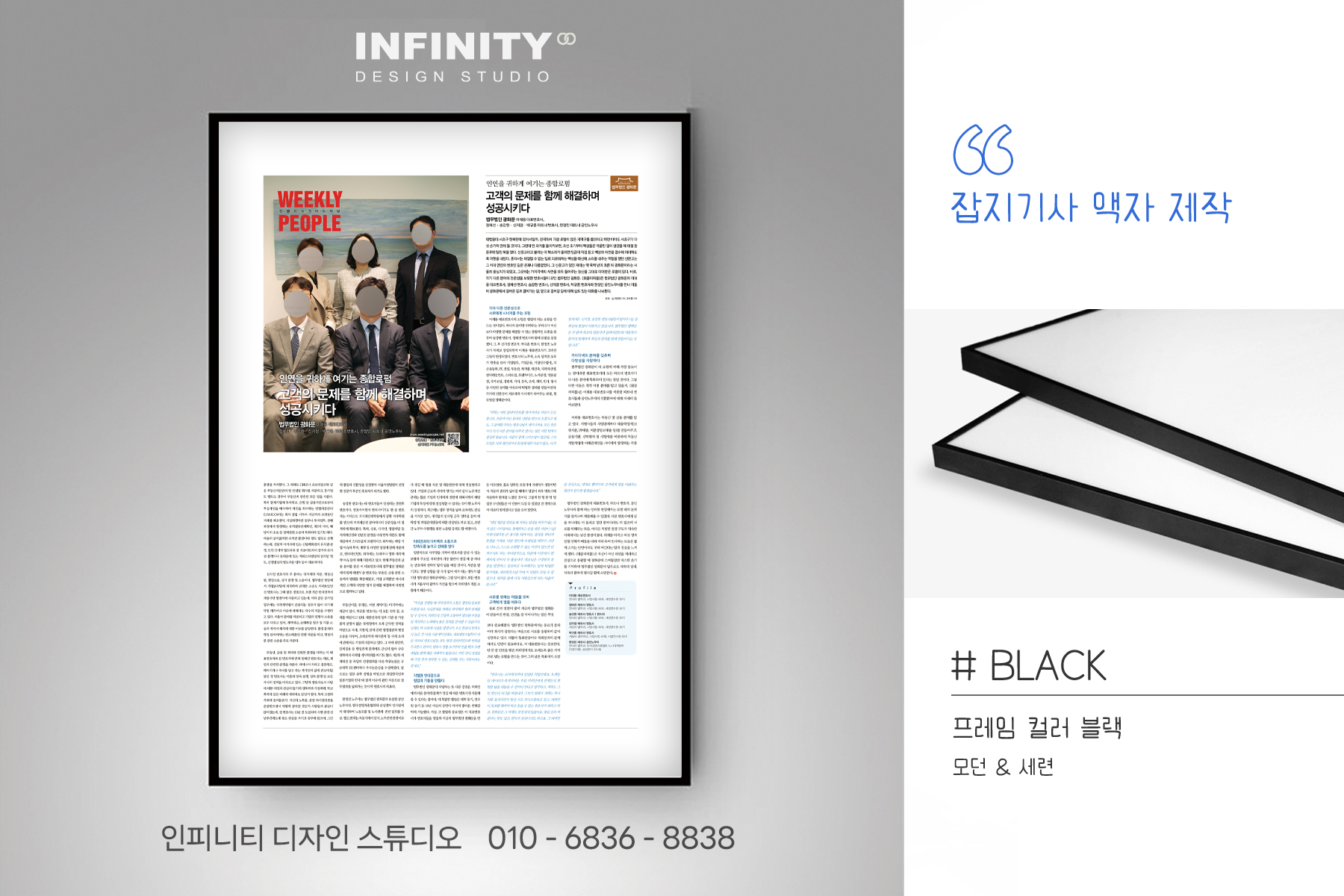 안녕하세요, 액자 디자인 + 제작 전문 인피니티 디자인 스튜디오 입니다. 깔끔한 아이템으로 제작되어 회사 홍보와 신뢰도를 쑥쑥 올리는 전시장 액자 제작, 신문기사 기념 액자로 완성해보세요