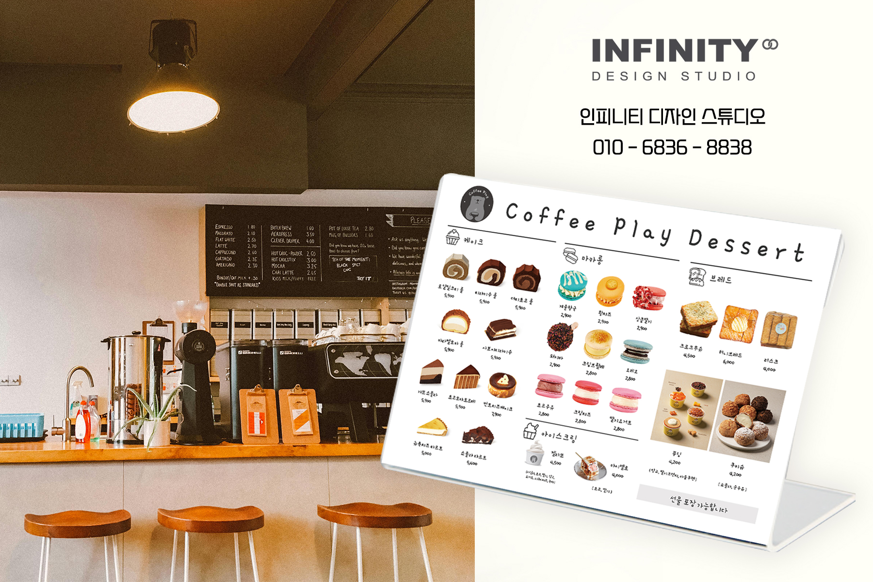 안녕하세요, 홍보물 제작 / 디자인 전문인피니티 디자인 스튜디오 입니다.카페 메뉴판 제작, 세워두는 아크릴 메뉴판,디저트 메뉴판 디자인, 인쇄 오늘은 디저트를 담은 카페 메뉴판 제작소