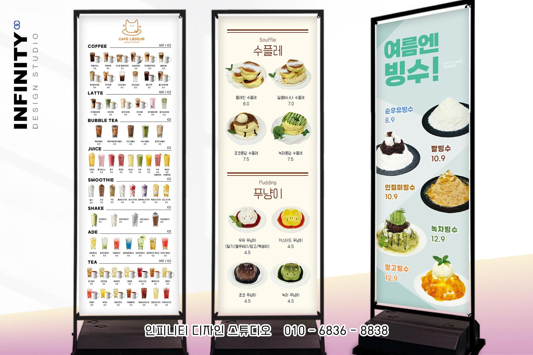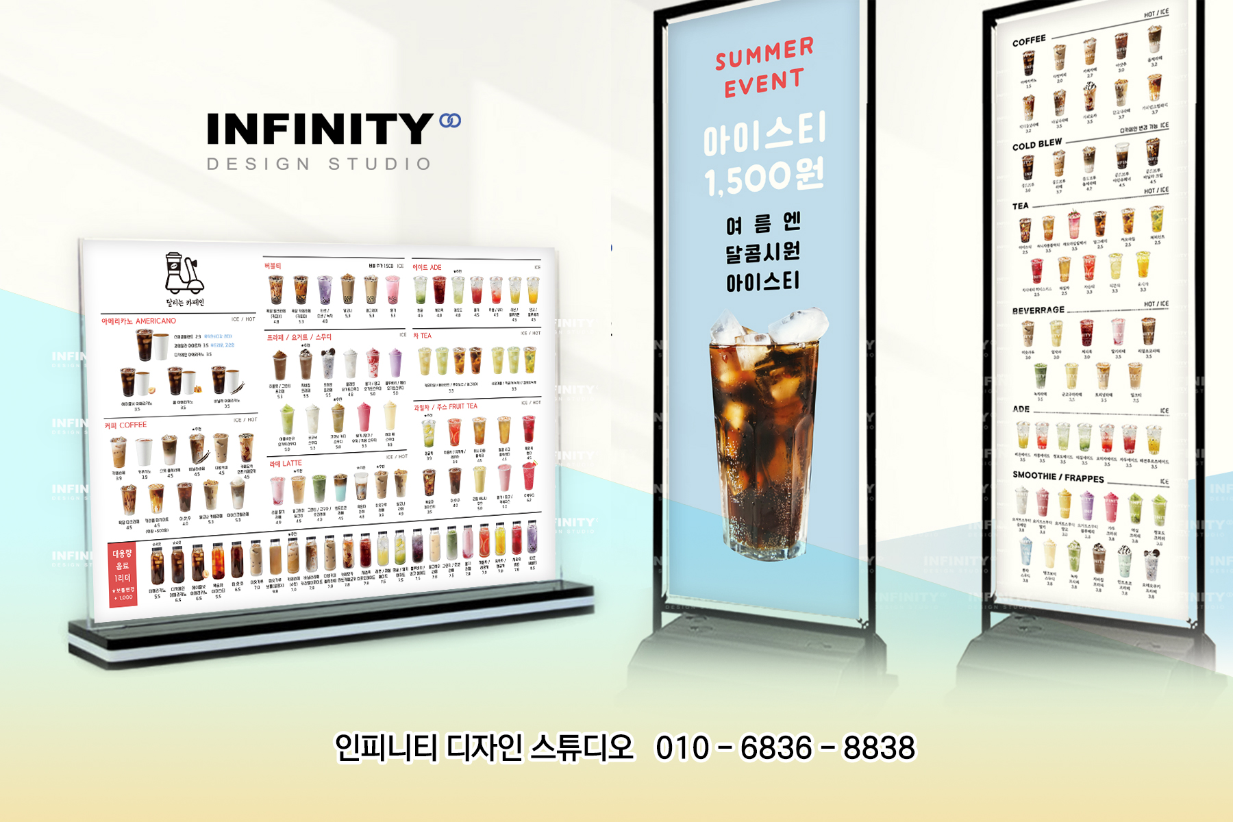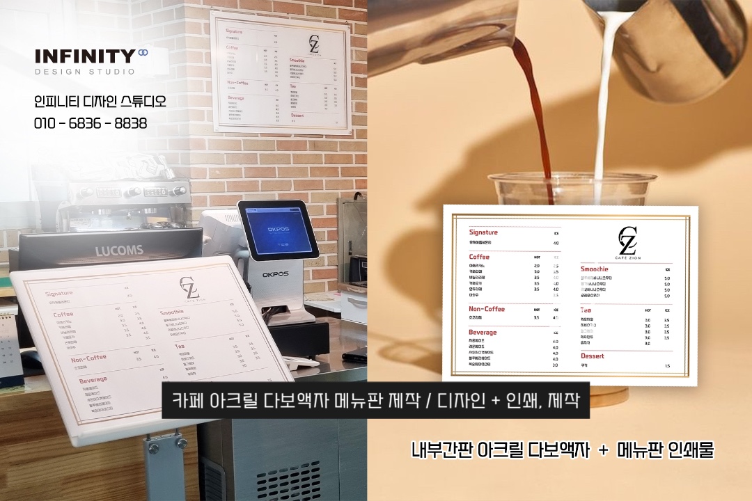 안녕하세요, 카페 홍보물 제작 전문인피니티 디자인 스튜디오 입니다. 카페 메뉴판 추천 소식 포스팅 시작합니다. 카페에서 판매하는 음료와 디저트를 담아아크릴 메뉴판으로 디자인 + 제작