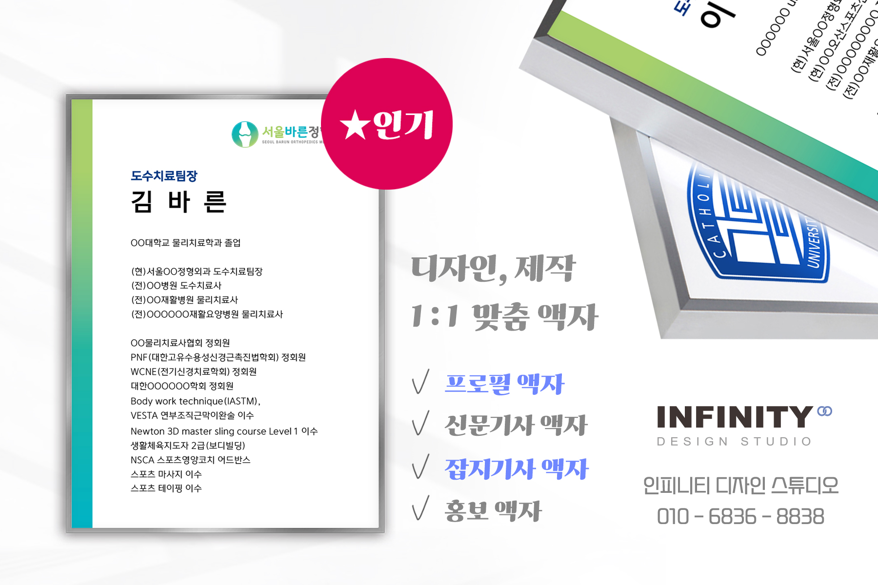 | 액자 제작, 프로필 액자 제작, 병원 맞춤 액자, 도수치료사 프로필액자, 정형외과 의사 액자 제작 (4) | 2024.09.26 |