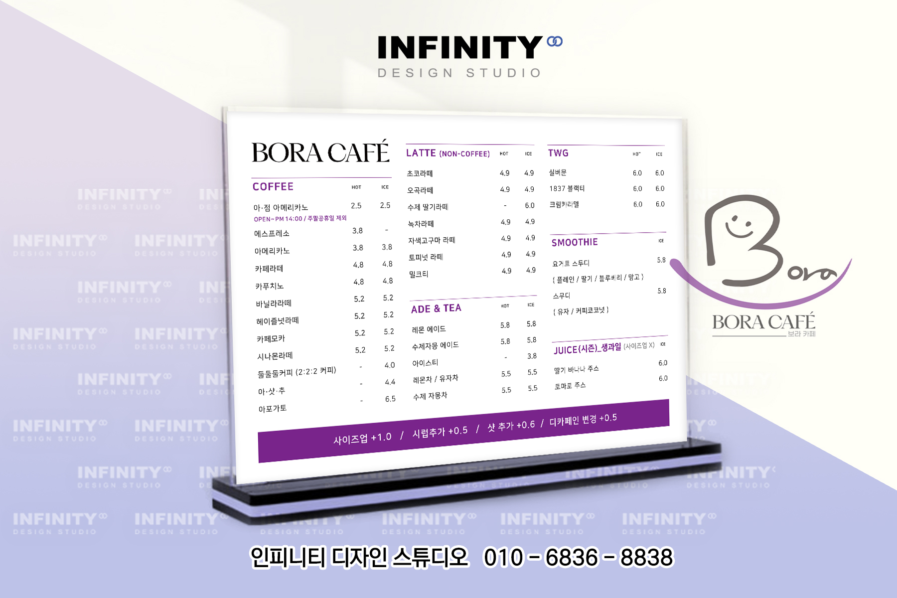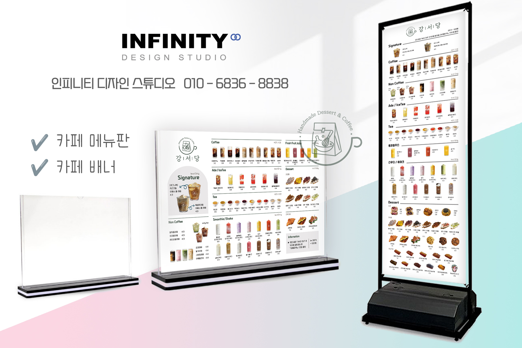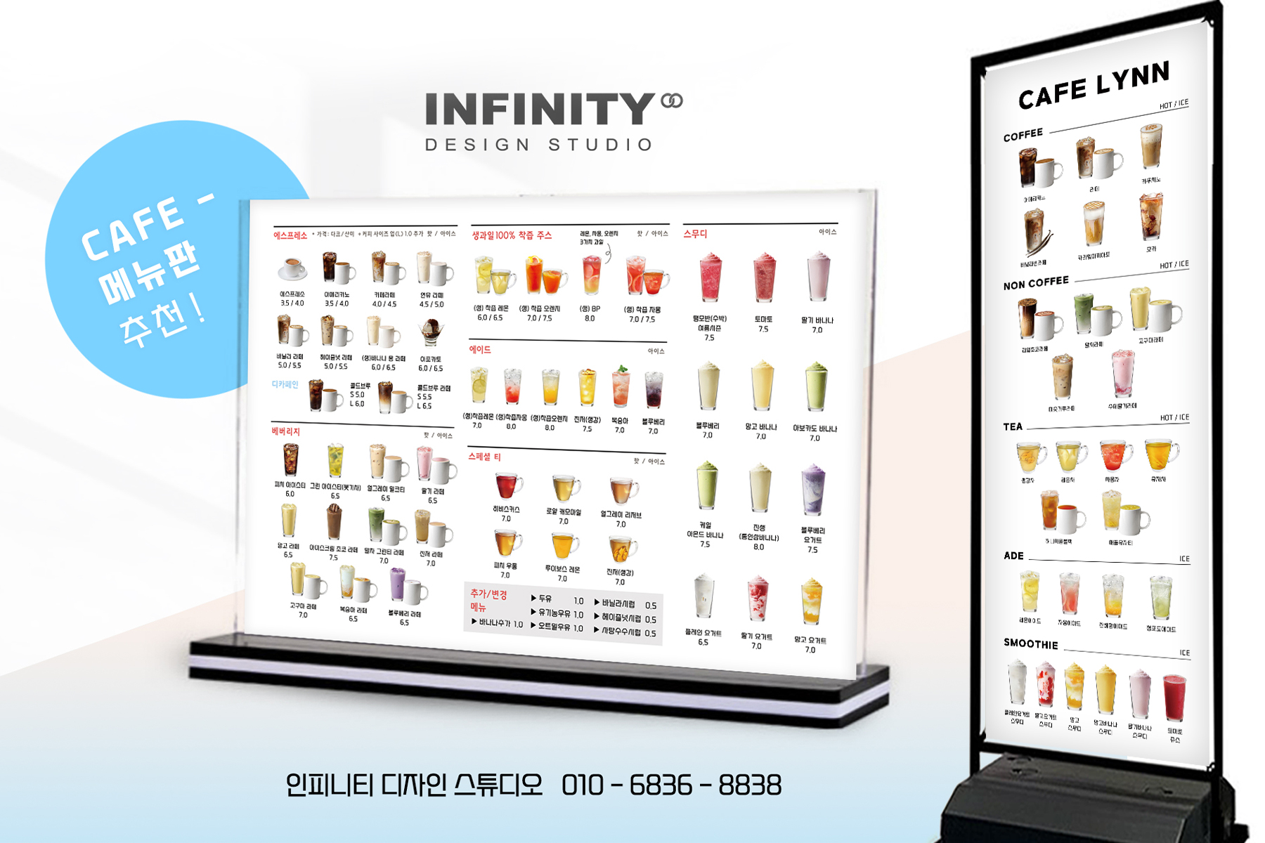 안녕하세요, 카페 홍보물 제작 전문인피니티 디자인 스튜디오 입니다. 카페 메뉴판 제작, 메뉴판 인쇄,아크릴 메뉴판 거치대 세트 원하는 곳에 세워둘수 있는 깔끔하고 예쁜메뉴판 제작 추천