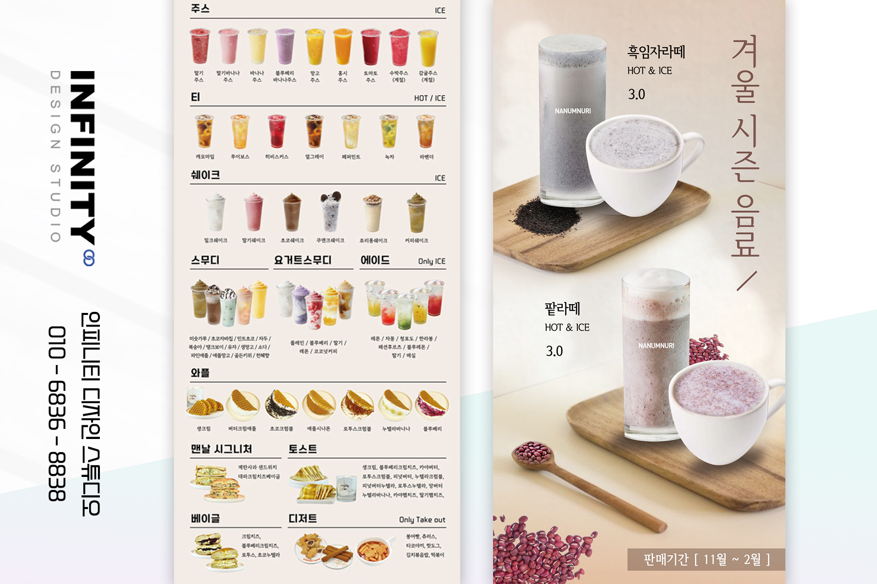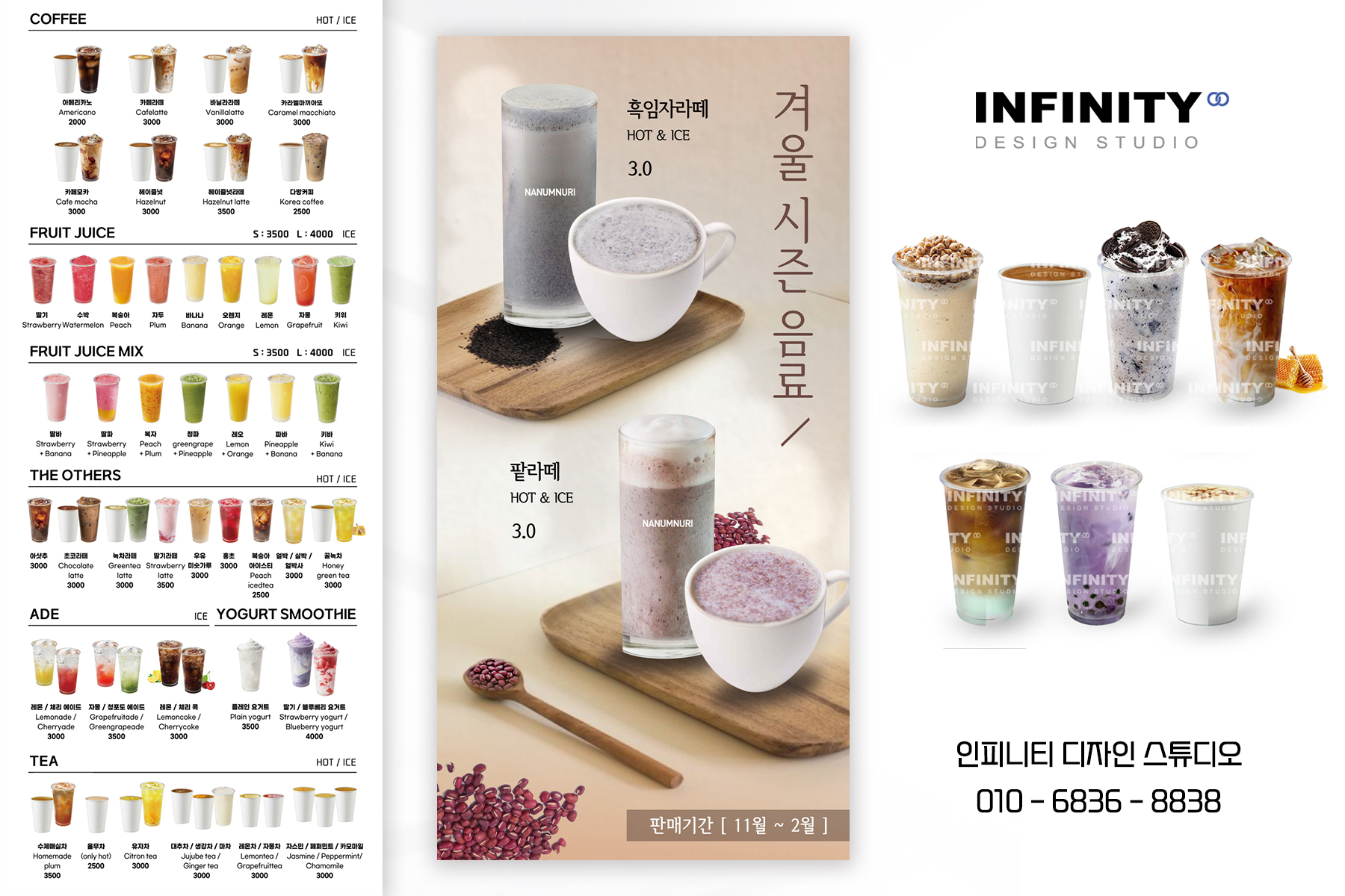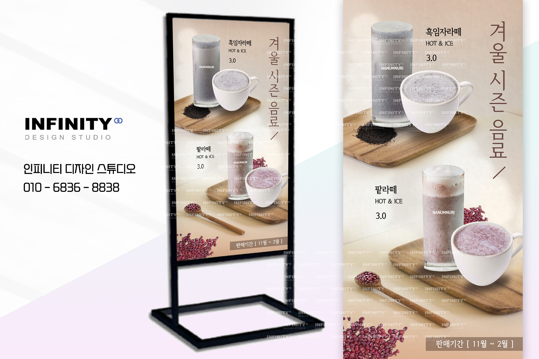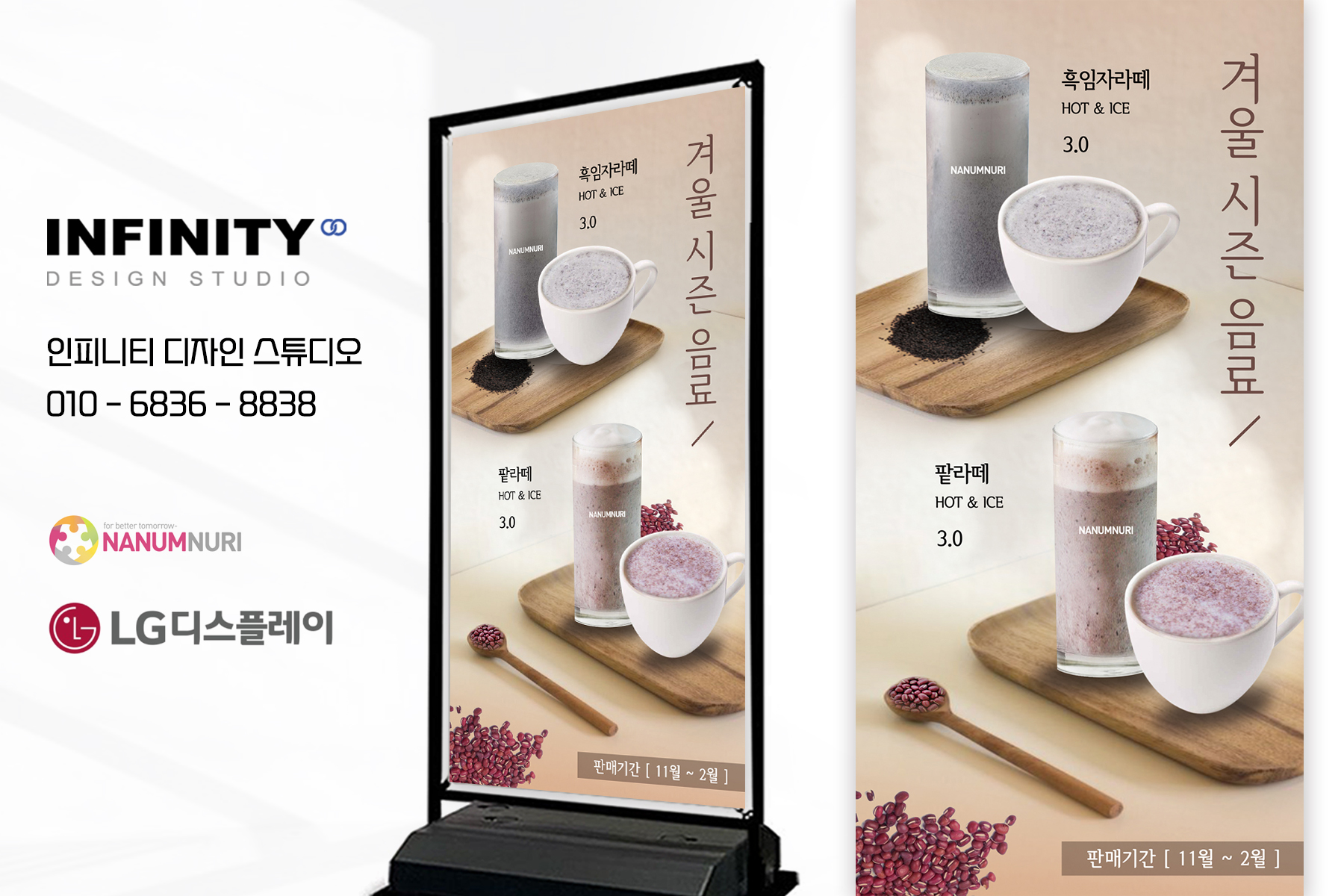 안녕하세요, 카페 디지털 LED 메뉴판 제작 전문 인피니티 디자인 스튜디오 입니다. 카페 운영 중 메뉴판 디자인이 필요한 경우, 원하는 컨셉과 사이즈로 제작해드리고 있습니다 ^^ 먼저, 영상으로