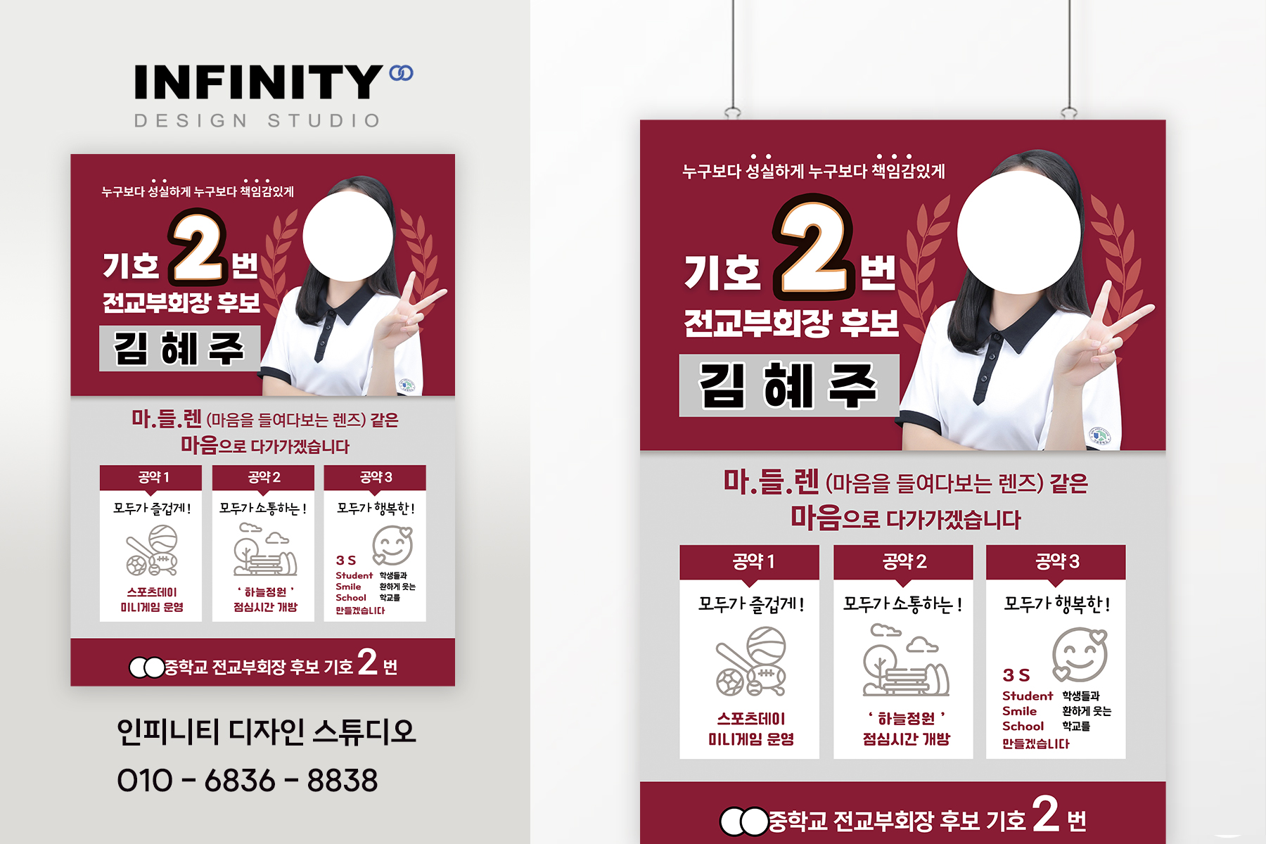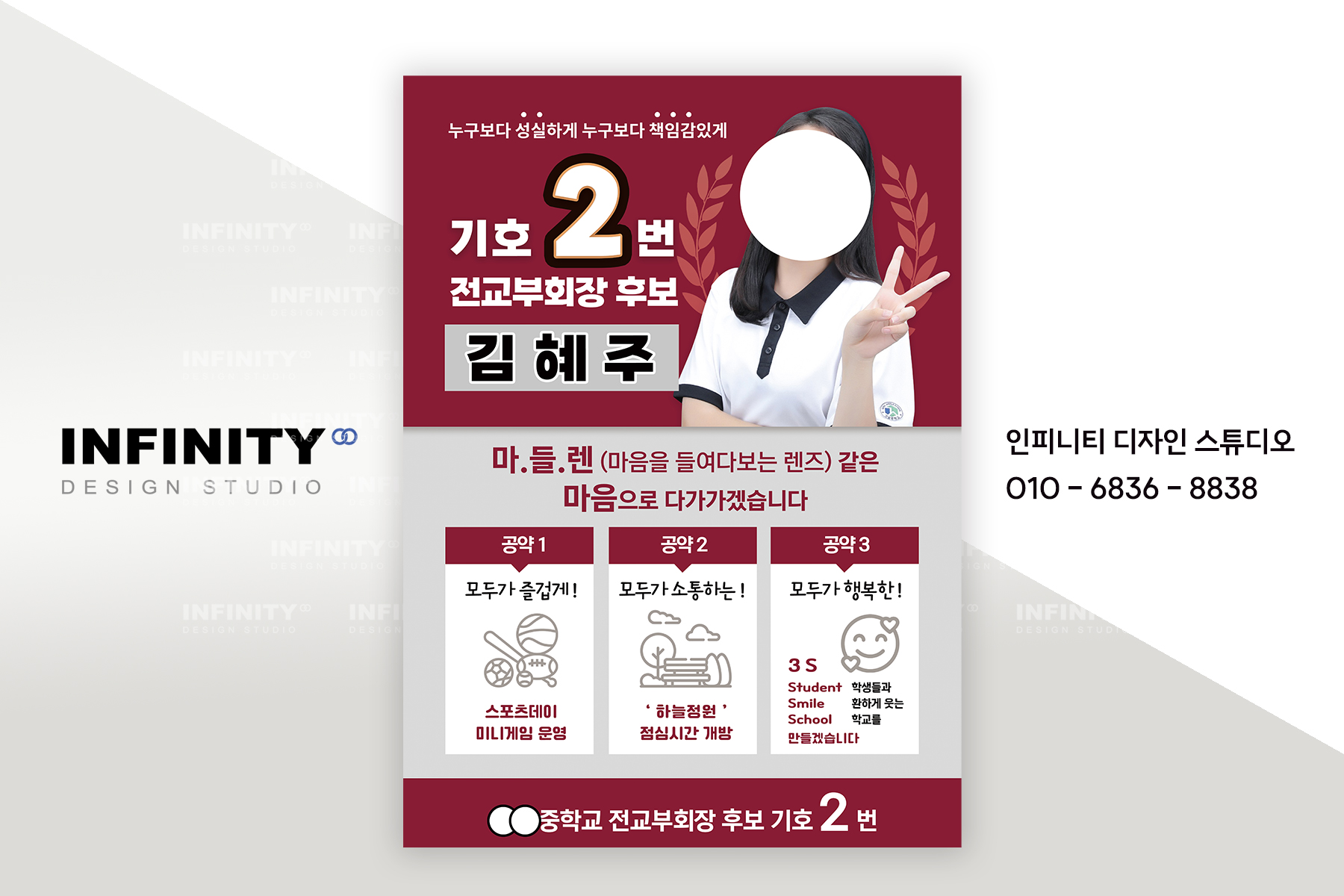 안녕하세요, 홍보물 제작, 디자인 전문인피니티 디자인 스튜디오 입니다. 오늘은 학생회장 선거포스터 제작 소식포스팅 준비했습니다 :) 고등학교 학생회장 선거 출마로의뢰해주신 포스터