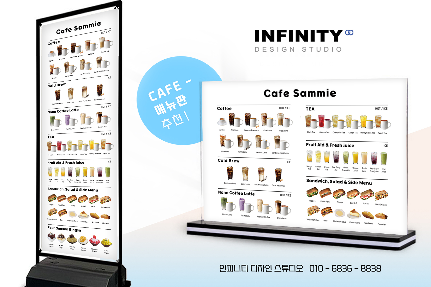 안녕하세요, 디자인, 제작 전문인피니티 디자인 스튜디오 입니다.오늘은 카페 메뉴판 / 자석 메뉴판 제작소식 포스팅 드려요 ! 자석메뉴판과 메뉴판 배너는필수템으로 인기만점인데요~! 카페