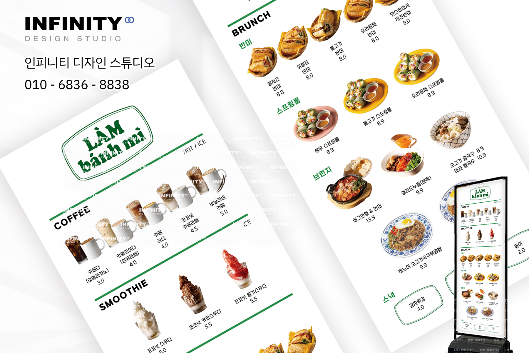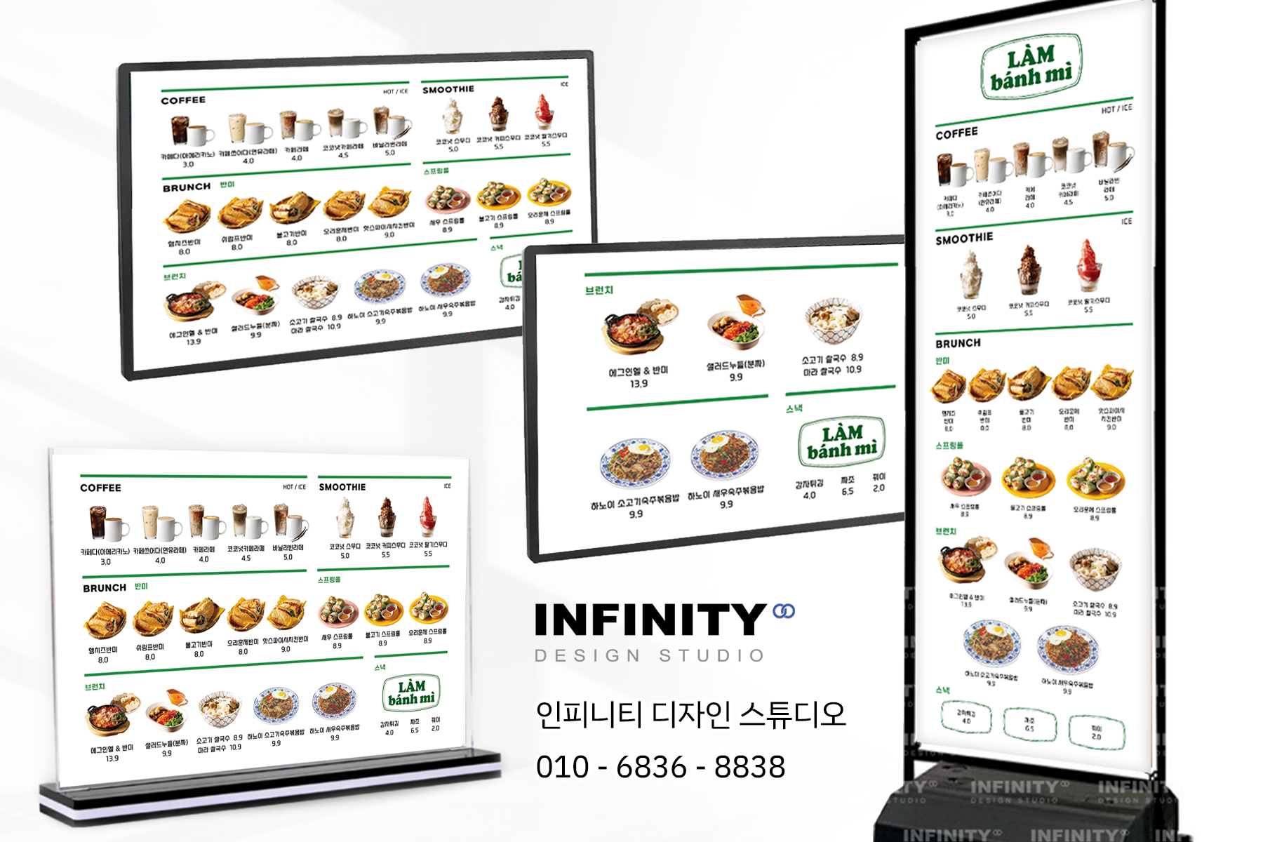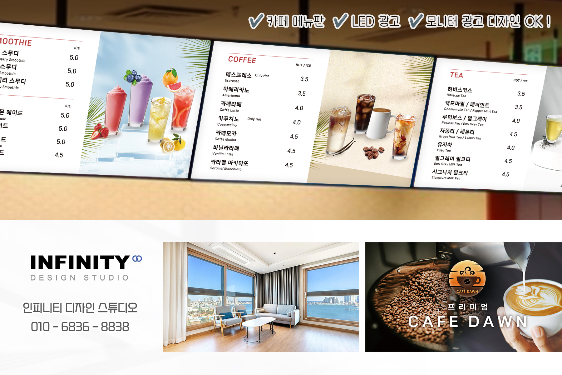 안녕하세요, 디자인, 제작 전문인피니티 디자인 스튜디오 입니다. 오늘은 카페 오픈 DID 메뉴판 디자인,키오스크 메뉴사진 세트 제작 소식포스팅 준비했습니다 :) 배너, 메뉴판, 사진세트, 광