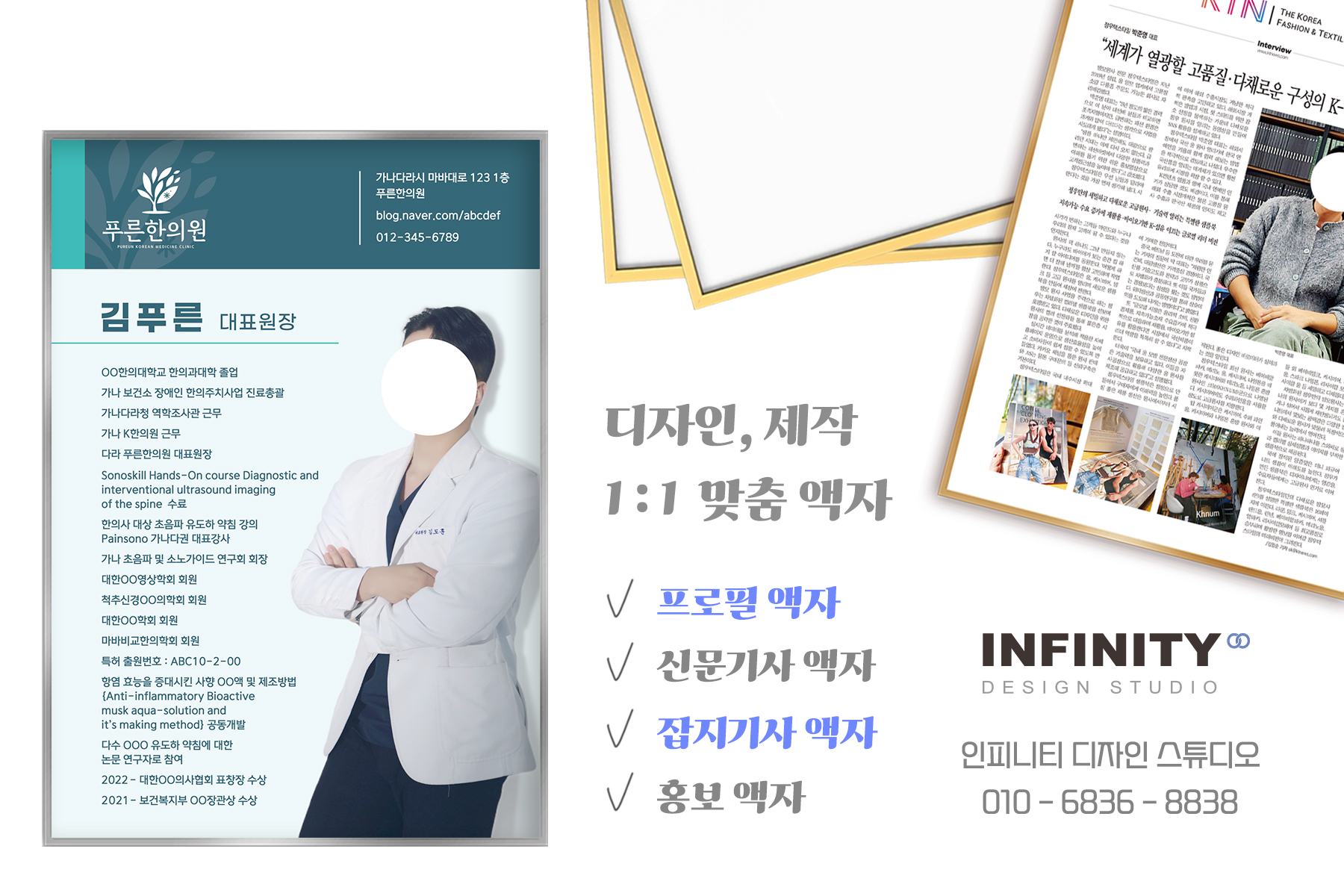 병원 액자 제작, 맞춤 액자, 신문기사 액자, 제품 액자, 원장님 의사 프로필 액자
