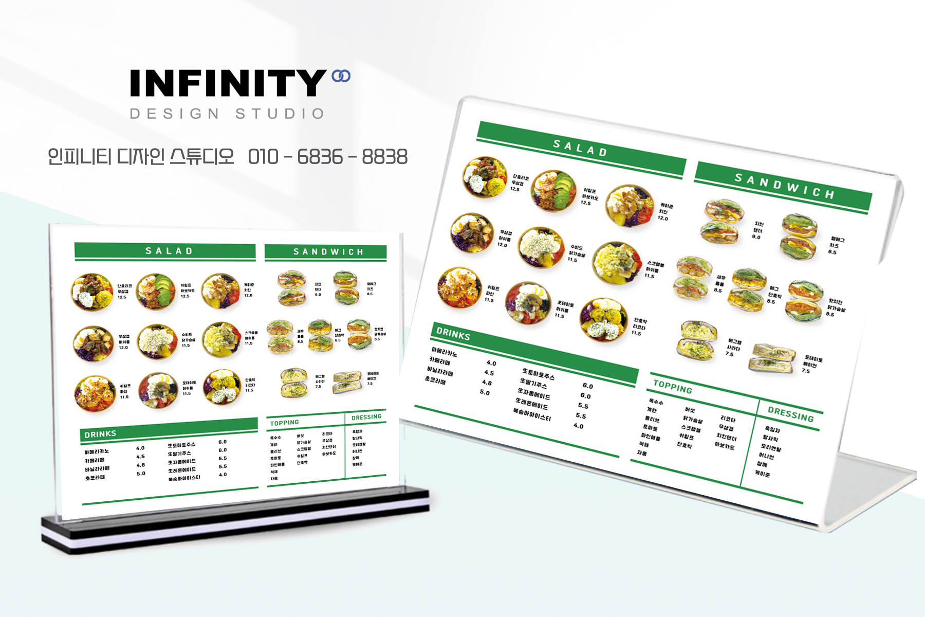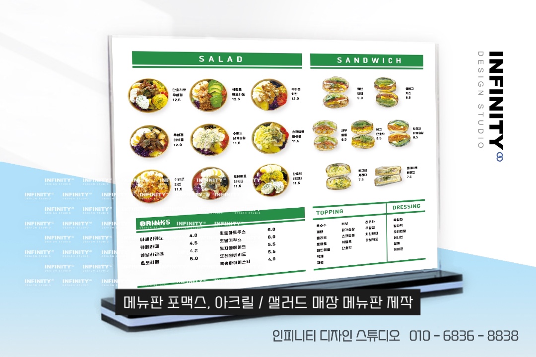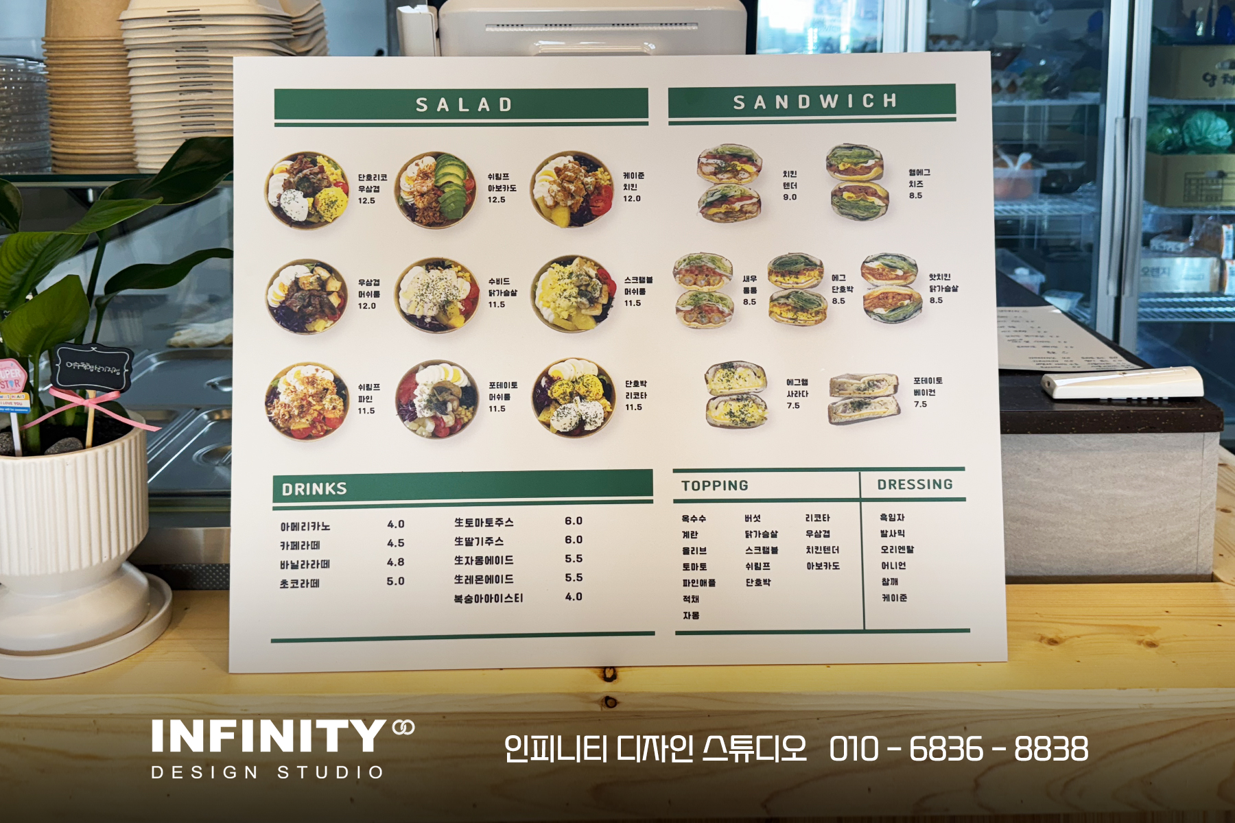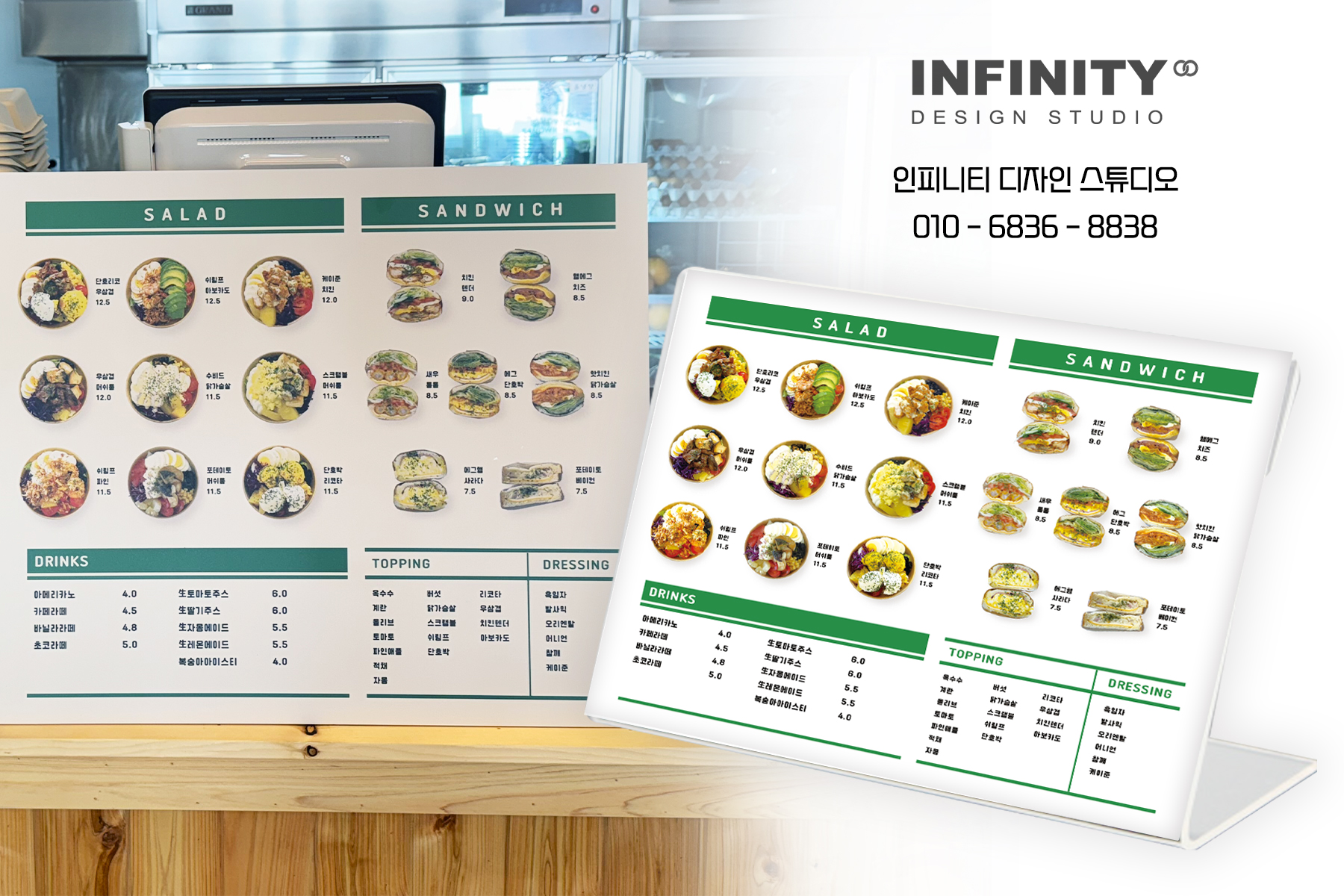 안녕하세요, 디자인, 제작 전문인피니티 디자인 스튜디오 입니다. 오늘은 샐러드 카페 배너 / 유리창 시트지디자인, 제작 소식 포스팅 드립니다 :) 각 메뉴를 모두 담은 메뉴판 배너와샐러드 / 커