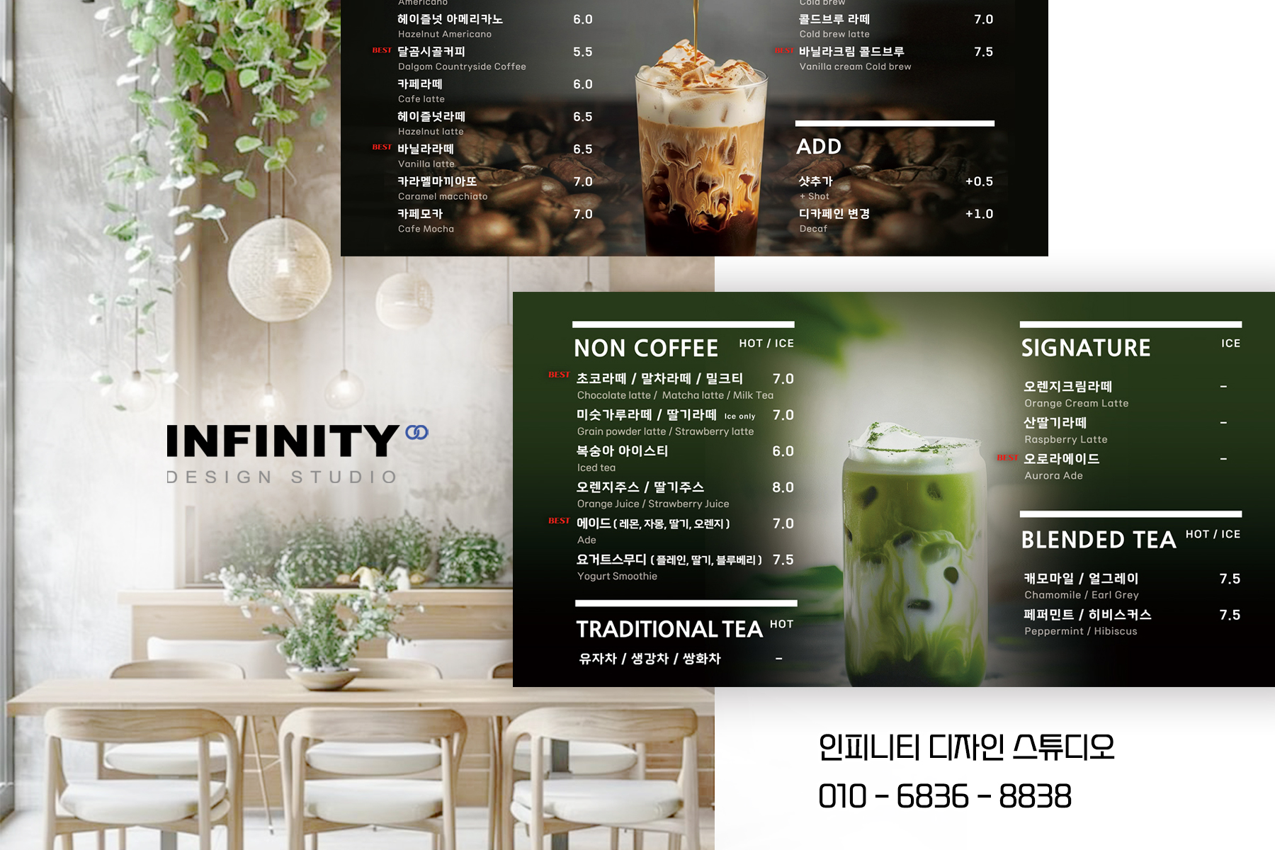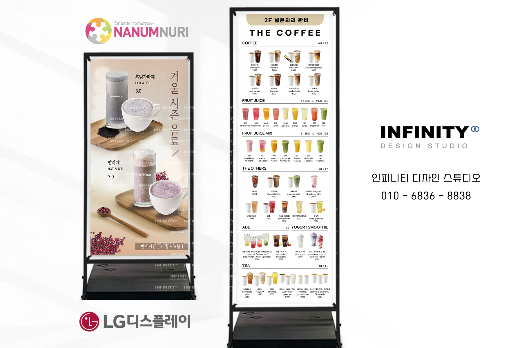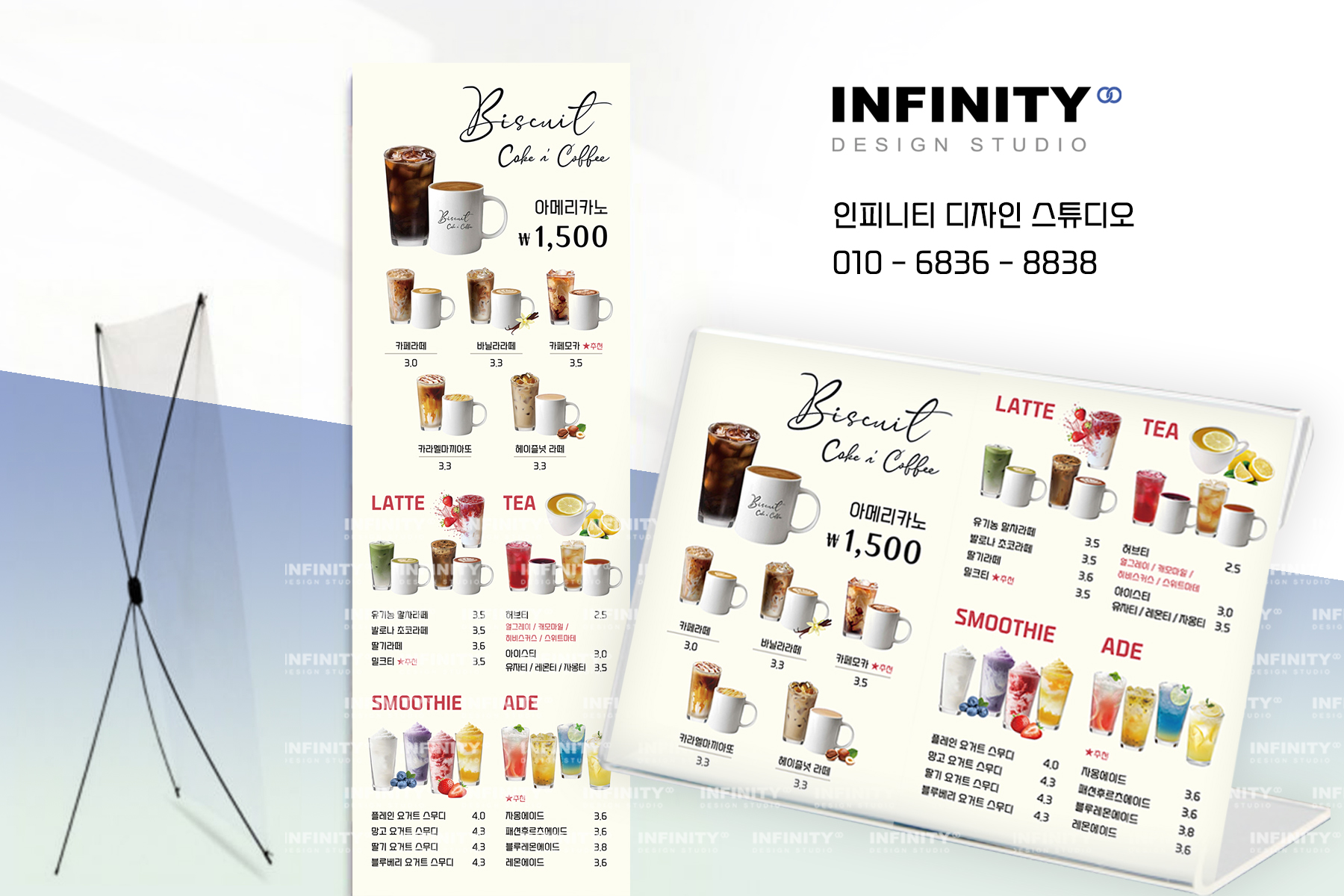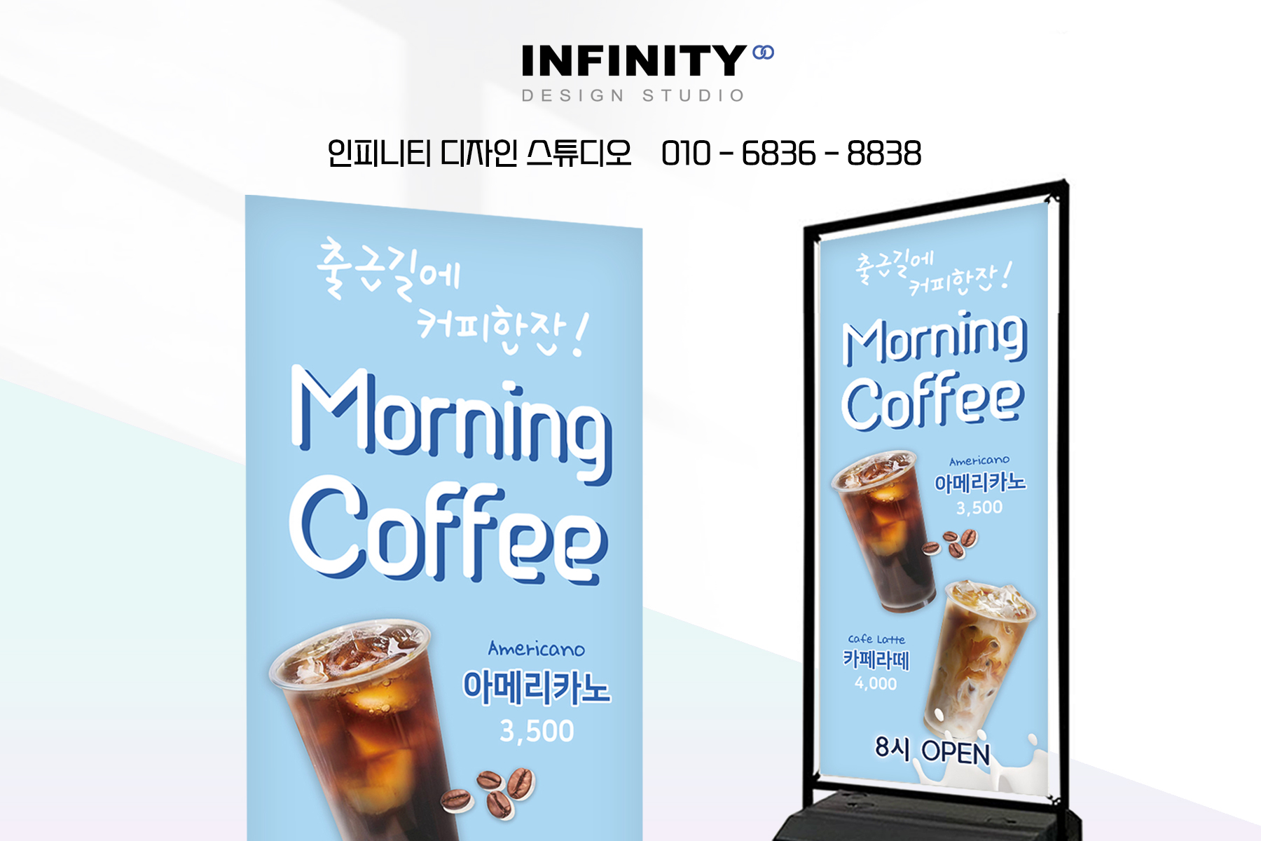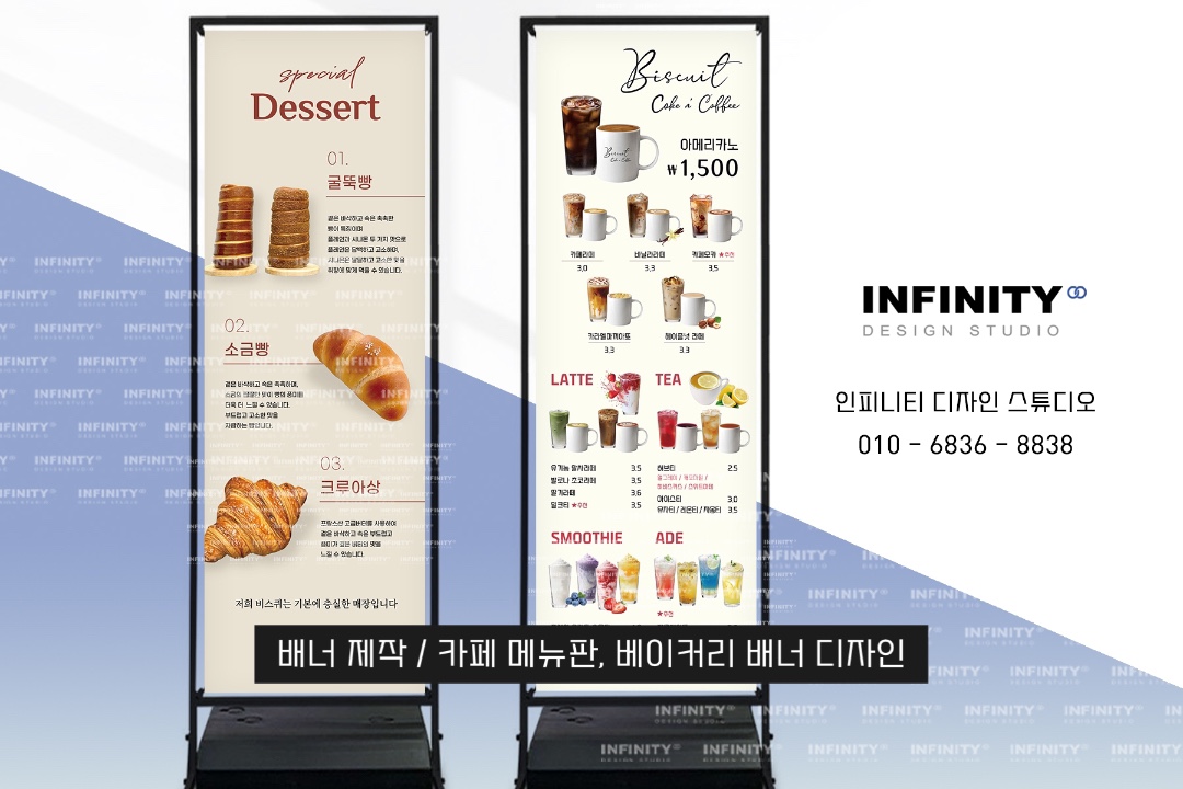 카페 오픈 준비, 카페 키오스크 사진촬영 제작, 배너 제작, DID 디자인, 카페 메뉴판 디자인, 인쇄