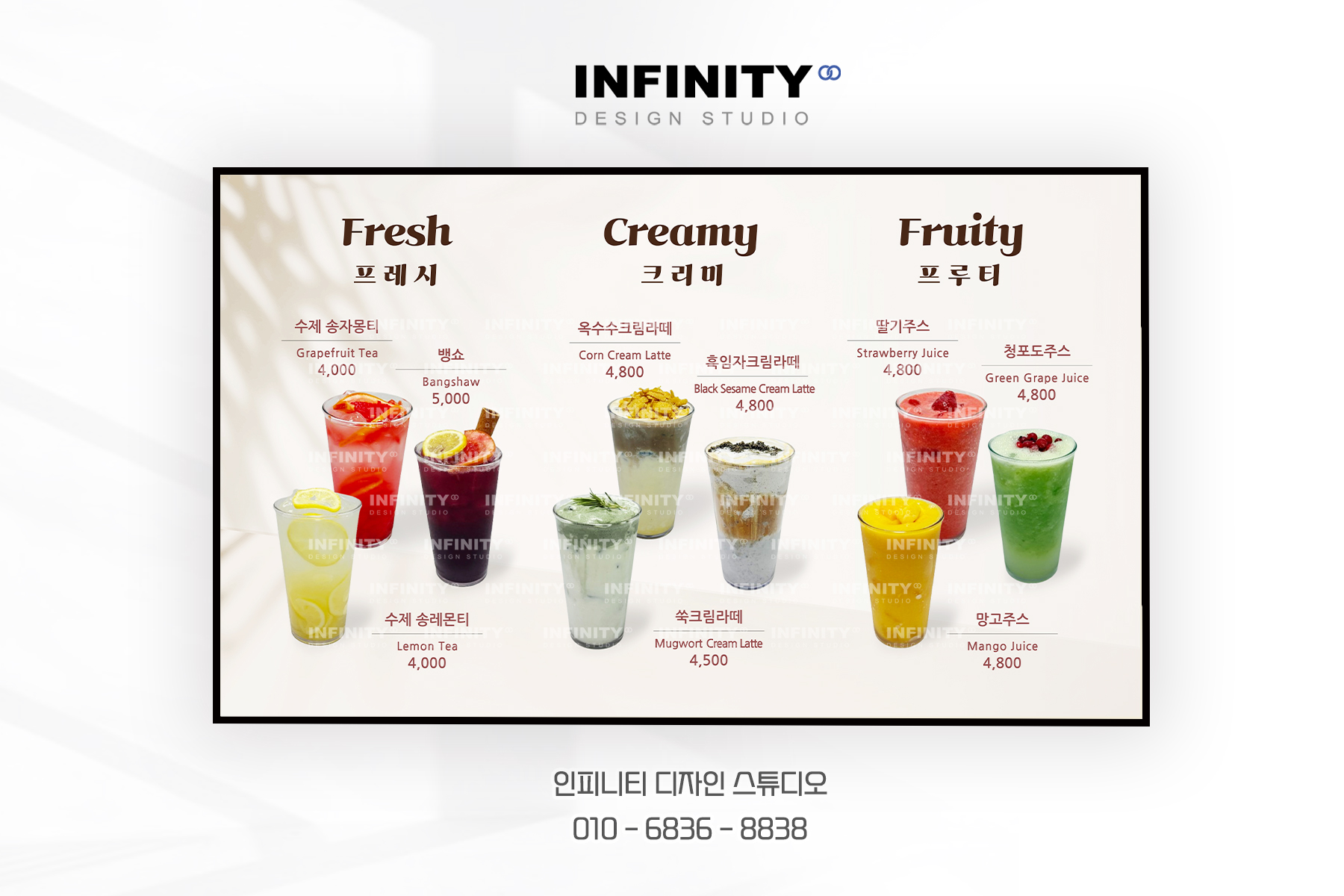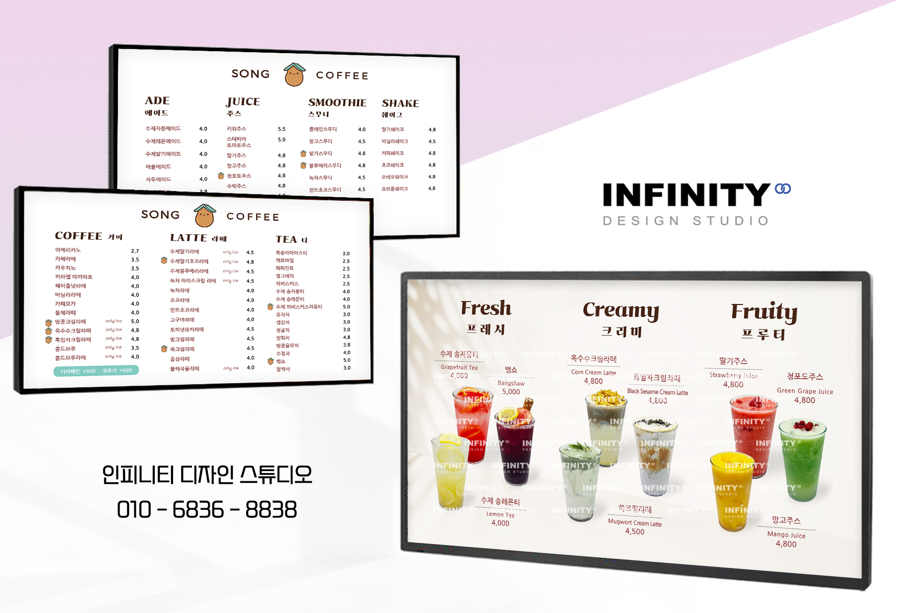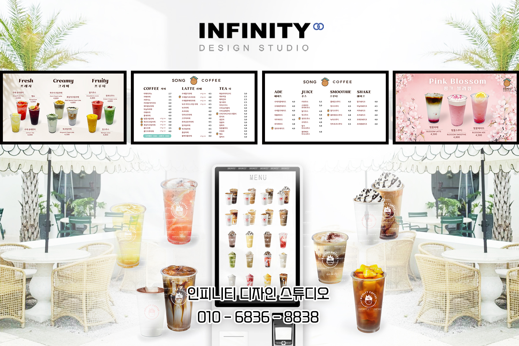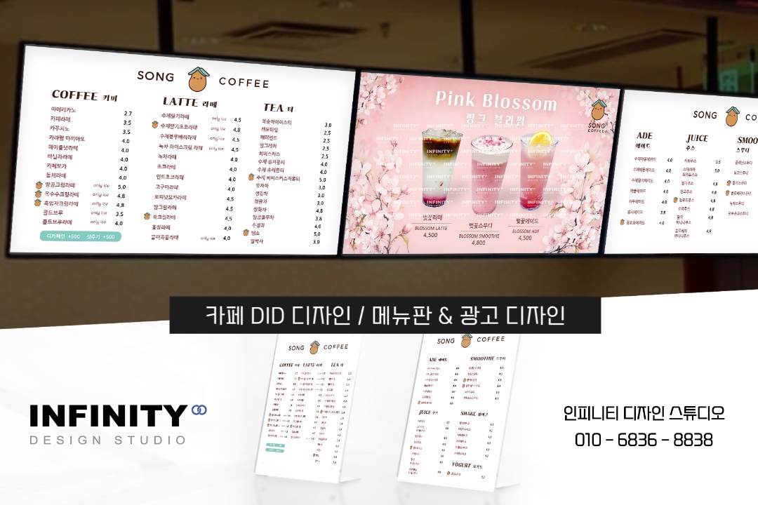 카페 오픈 준비, 카페 키오스크 사진촬영 제작, 배너 제작, DID 디자인, 카페 메뉴판 디자인, 인쇄