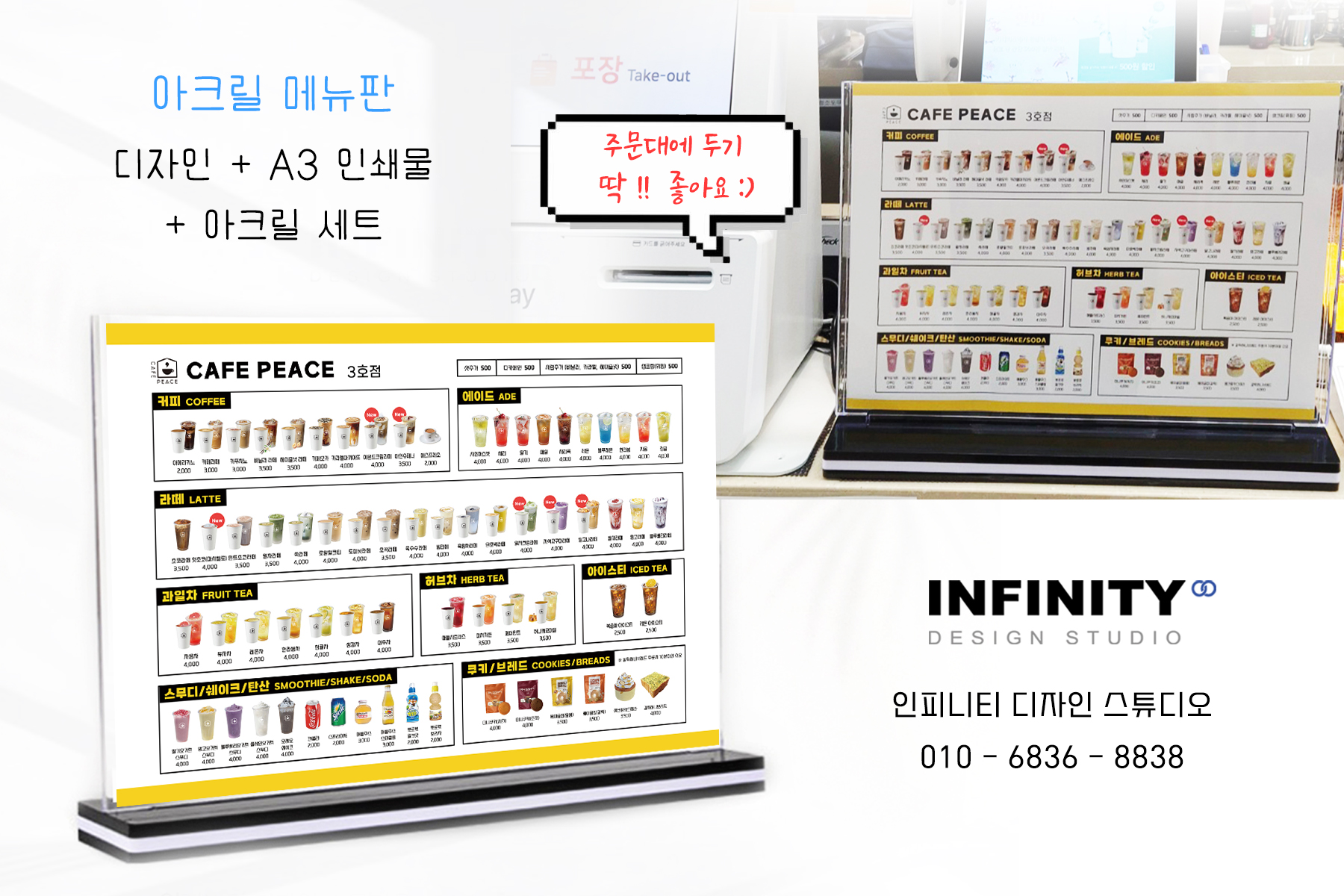 안녕하세요, 디자인, 제작 전문인피니티 디자인 스튜디오 입니다.오늘은 카페 베이커리 메뉴판 DID,아크릴 메뉴판, 시즌메뉴 홍보물 등디자인 + 제작 소식 포스팅 드립니다 :) 우리매장에 필요한