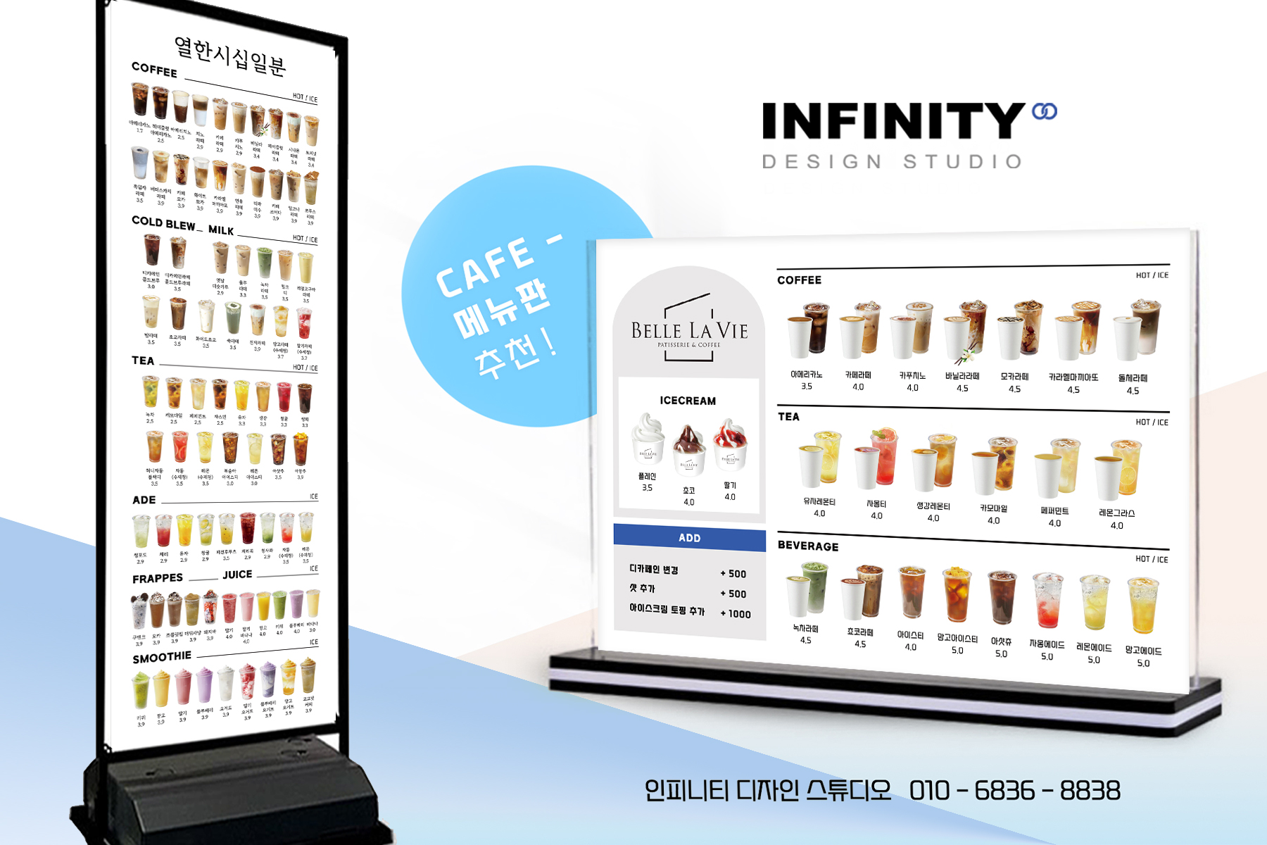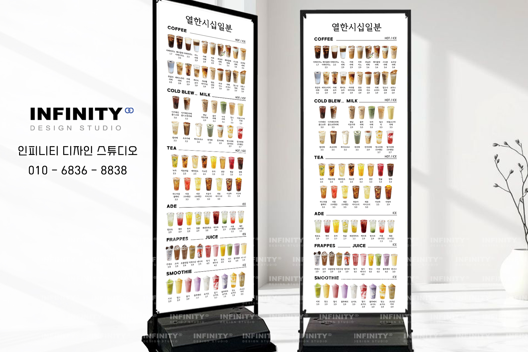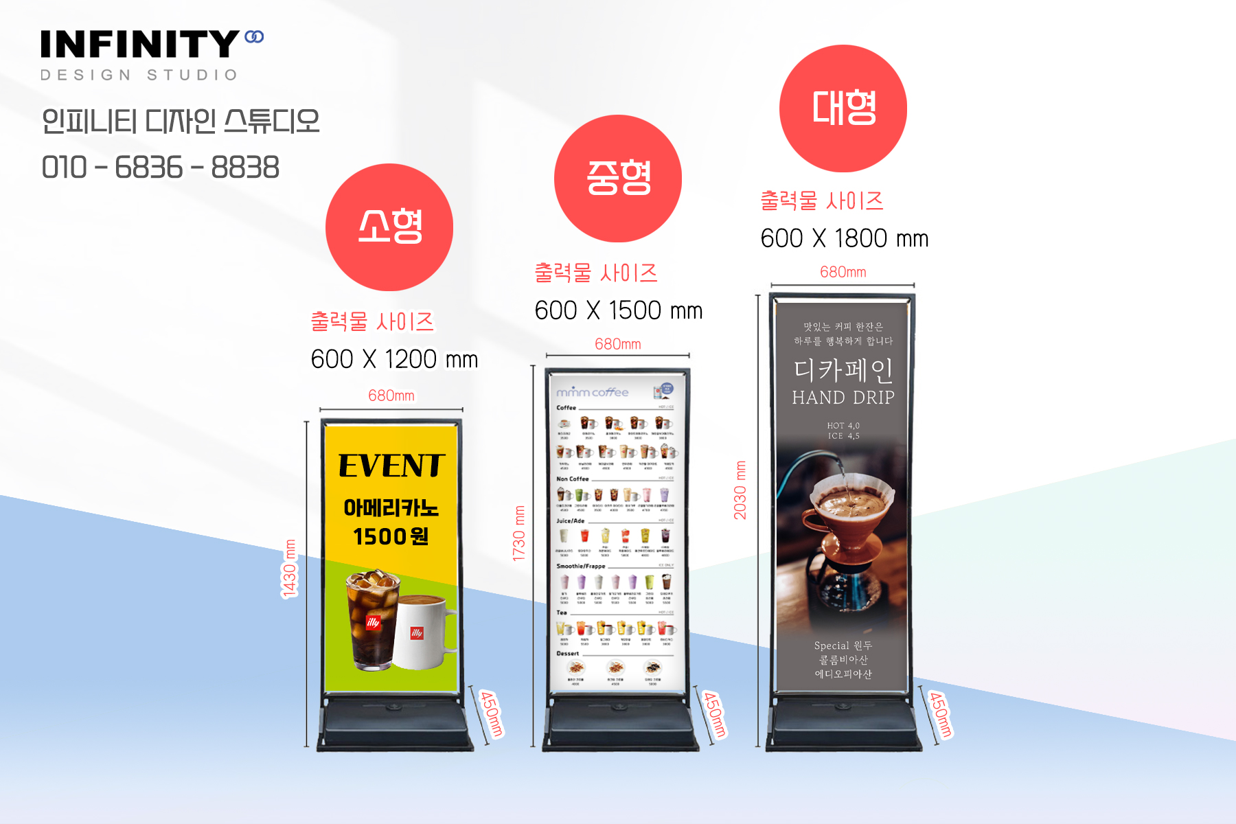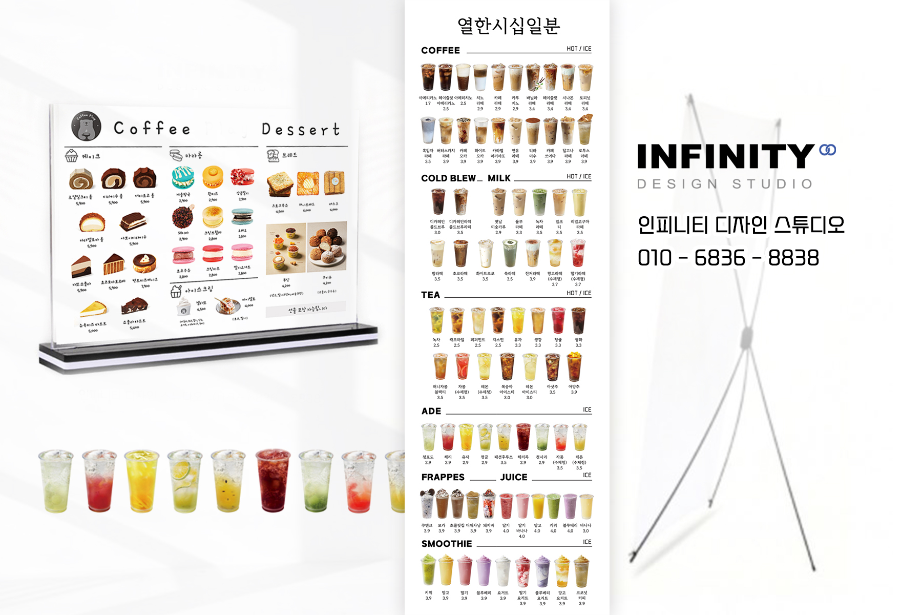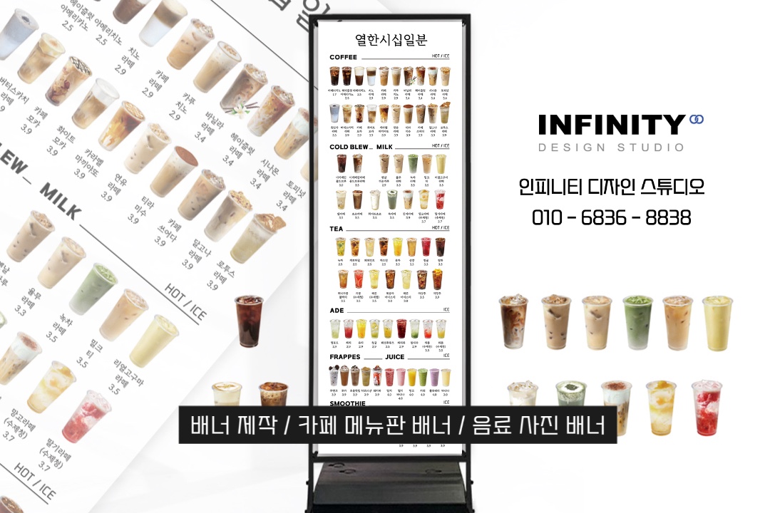 카페 메뉴판 배너는 단순한 안내판이 아니라, 매장의 분위기를 전달하고 고객의 선택을 돕는 중요한 역할을 합니다. 인피니티 디자인 스튜디오와 함께라면, 매장에 딱 맞는 메뉴판 배너를 제작하실 수 있습니다. 언제든지 문의주세요!