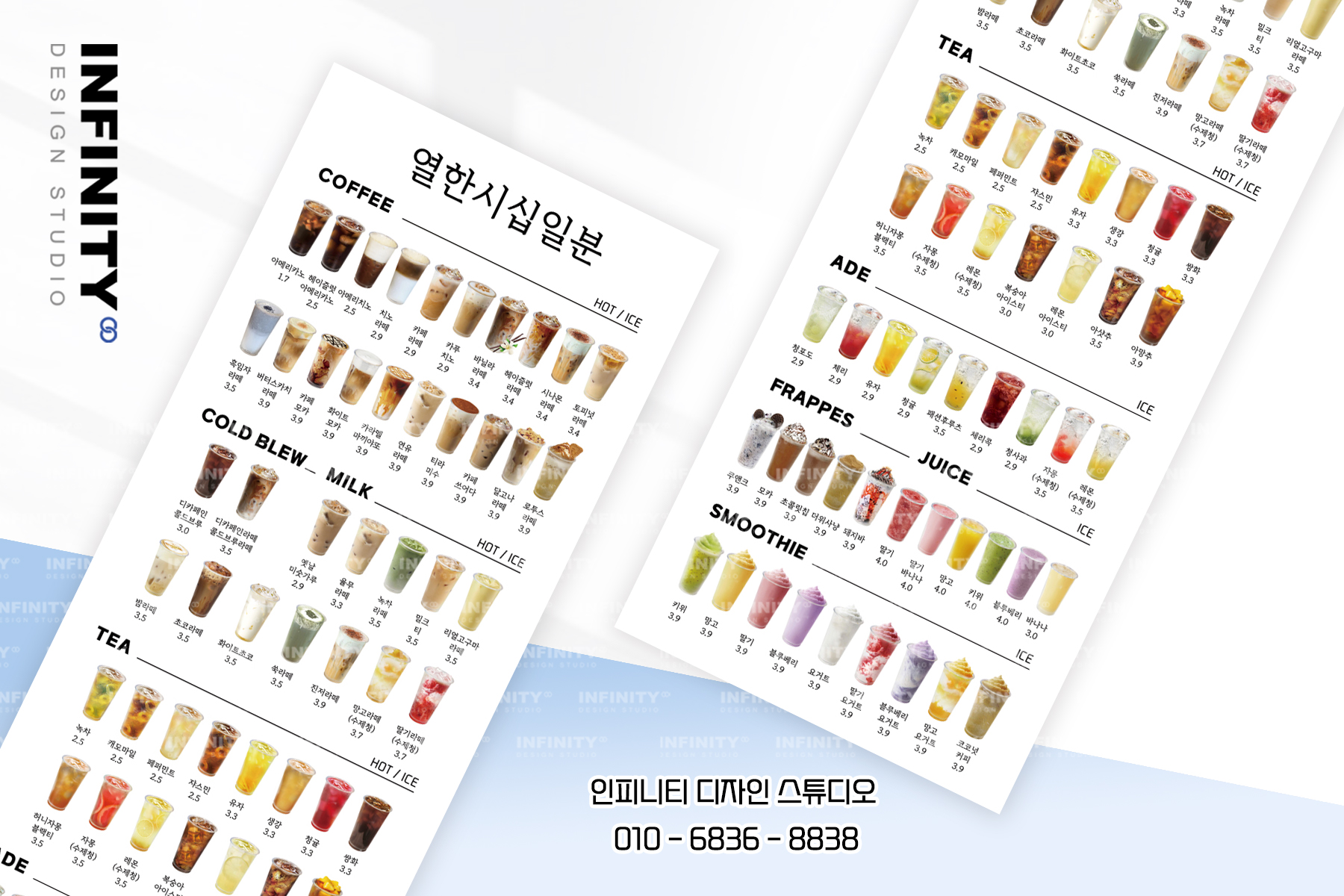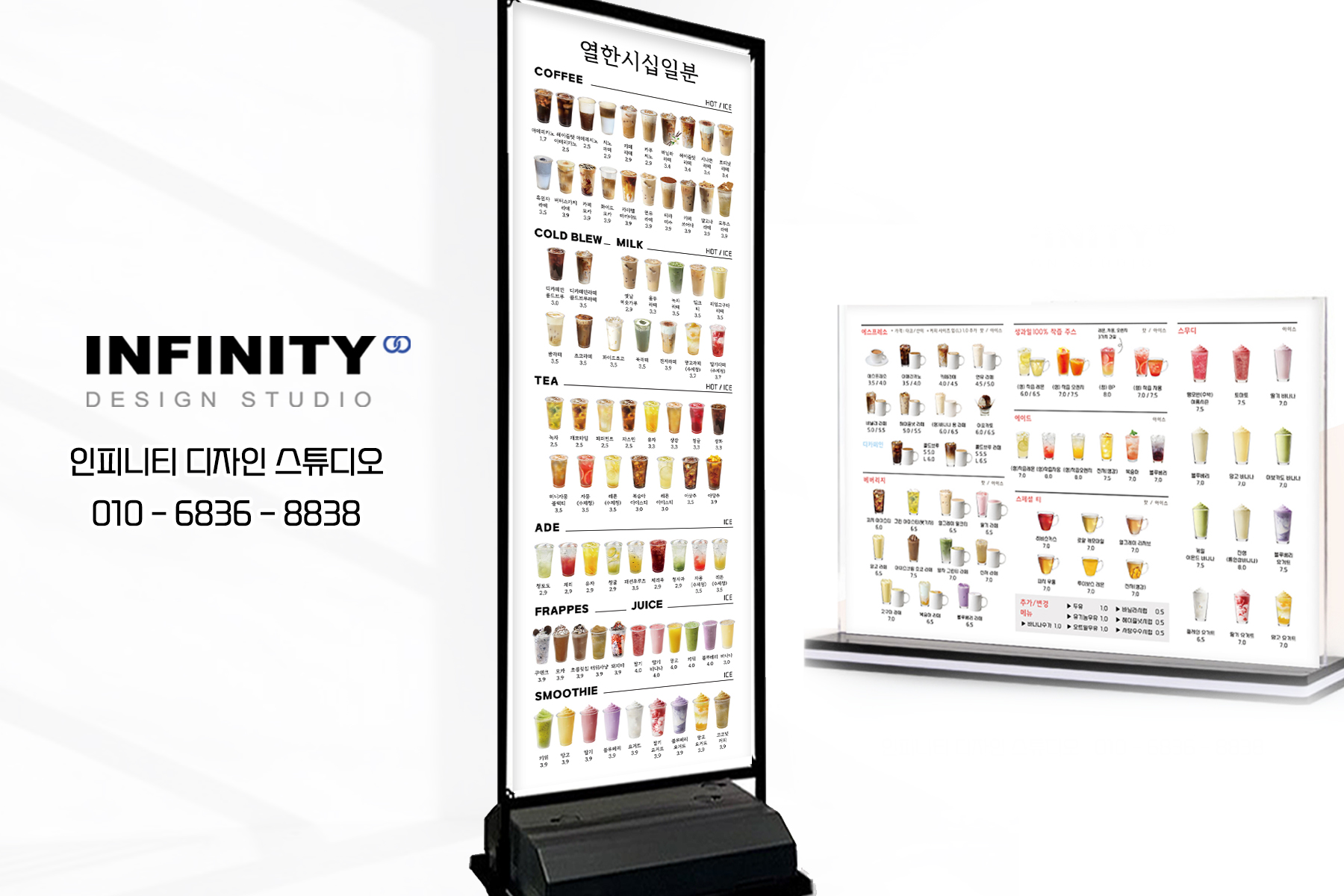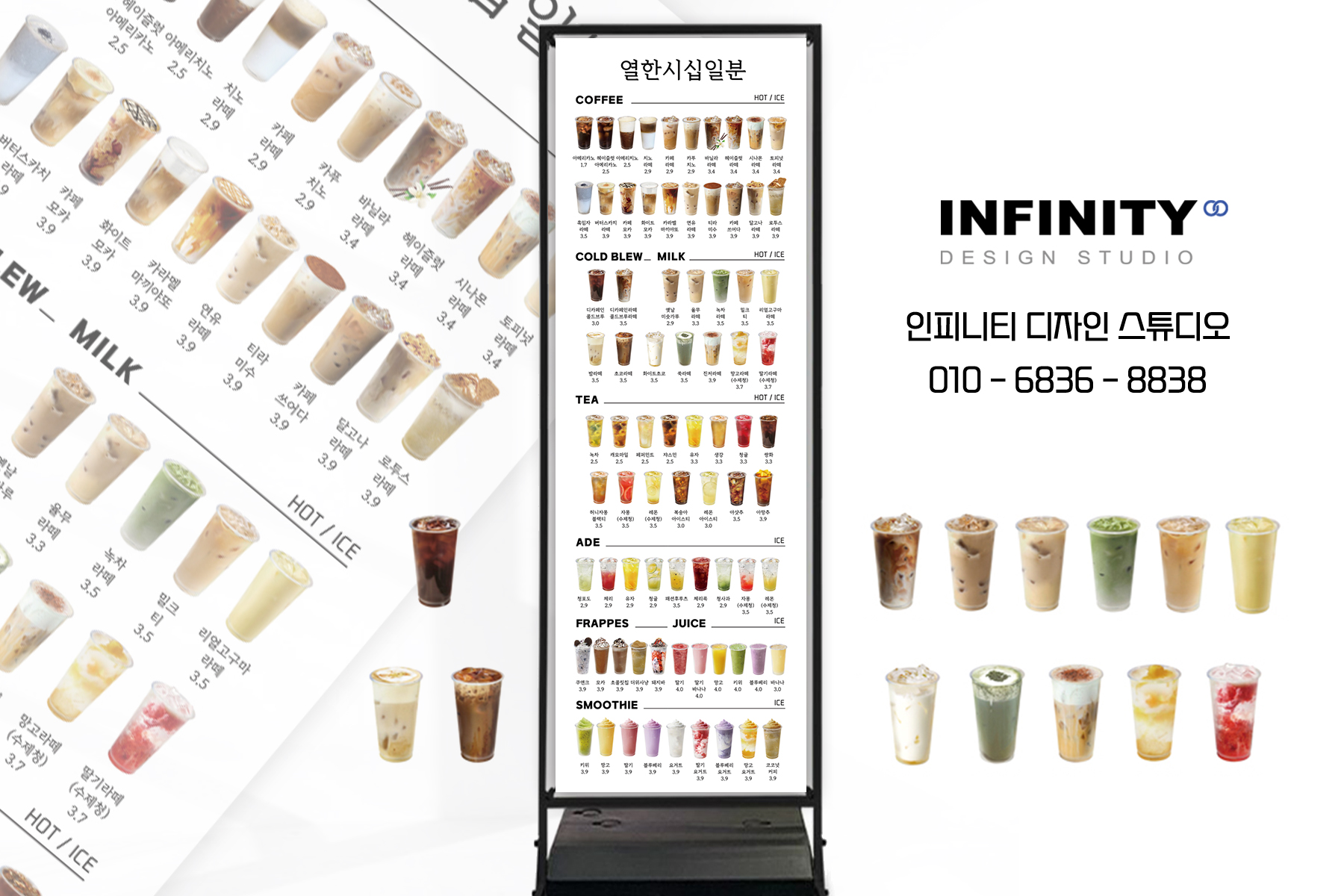 수많은 카페 및 F&B 브랜드카페 키오스크 메뉴사진 세트 진행으로우리매장 메뉴에 맞게 맞춤 진행해드립니다 :) 안녕하세요, 디자인, 제작 전문인피니티 디자인 스튜디오 입니다 :) 오늘은 카페