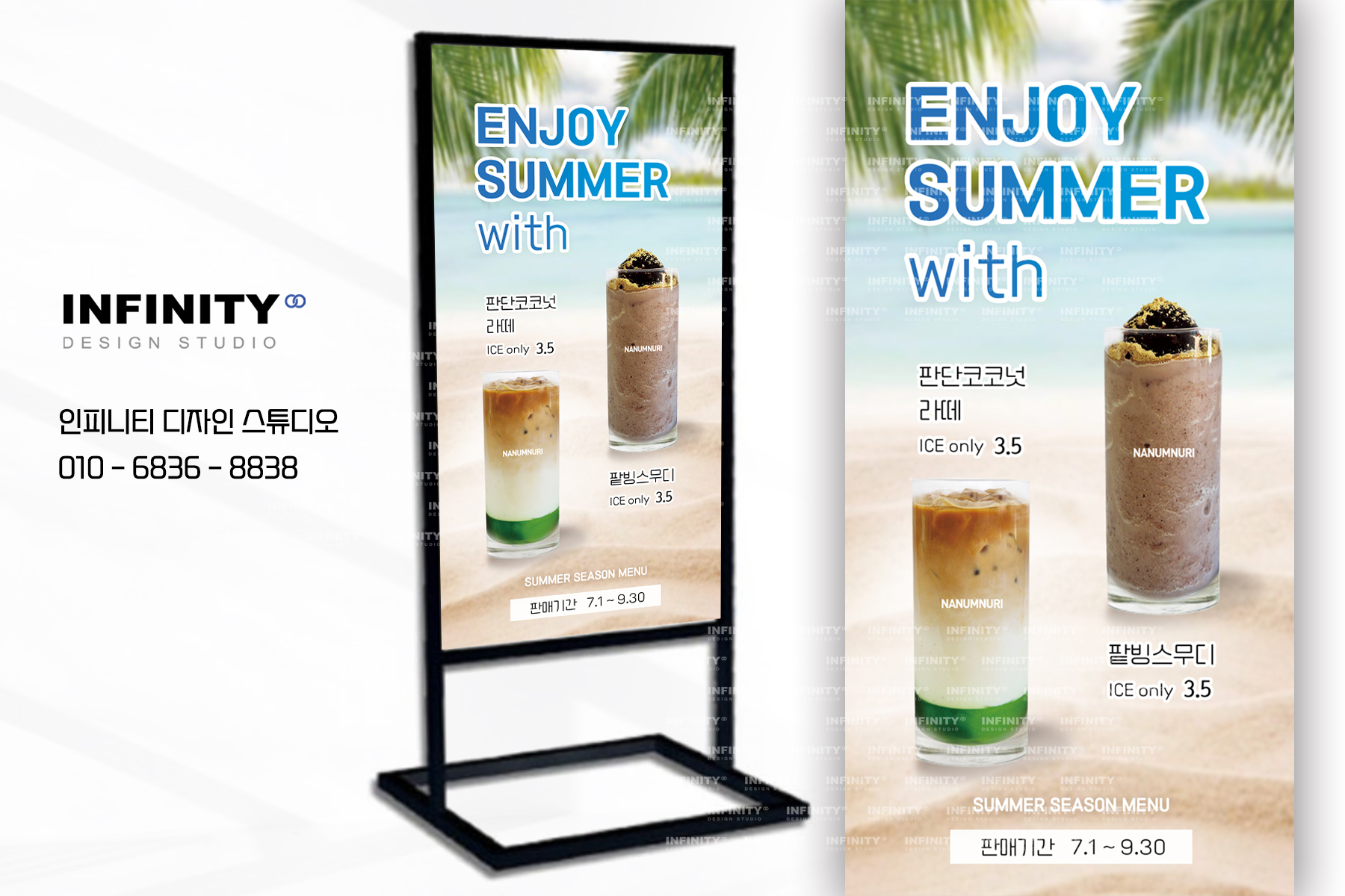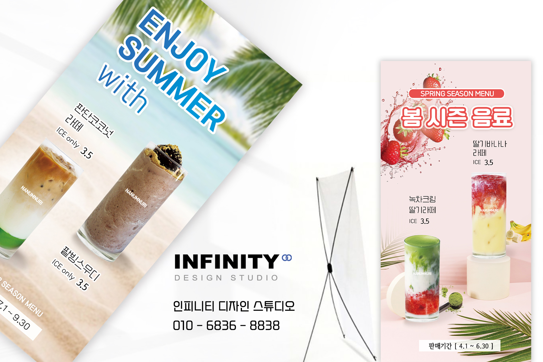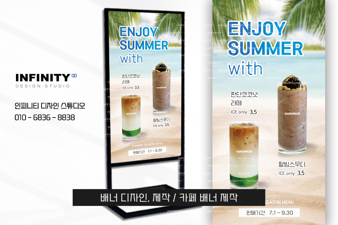 안녕하세요, 디자인, 제작 전문인피니티 디자인 스튜디오 입니다 :)오늘은 카페 배너와 포스터 제작 소식포스팅 준비했습니다 홍보하고 싶은 메뉴 구성으로 의뢰해주신카페 배너 + 포스터 세트