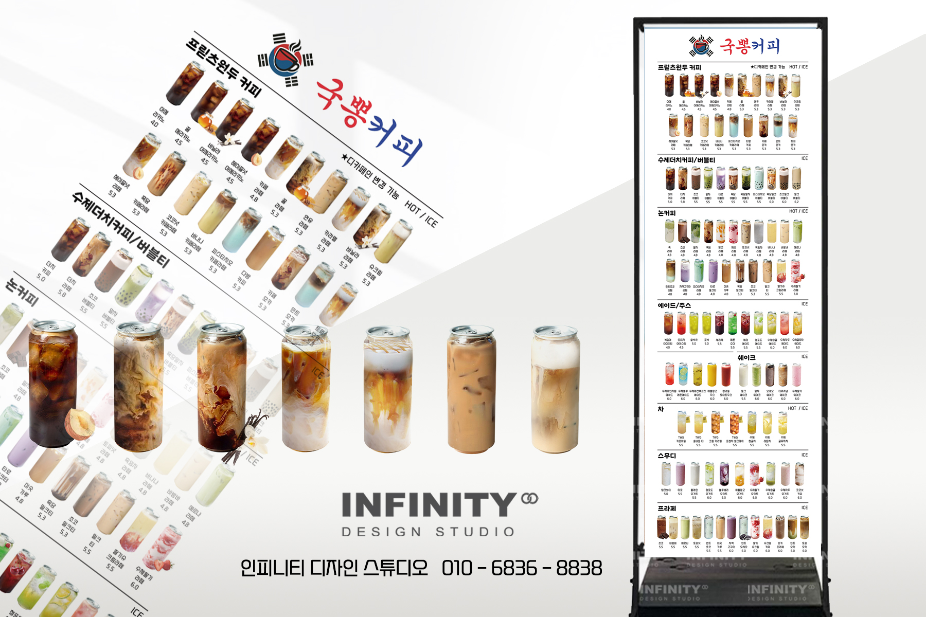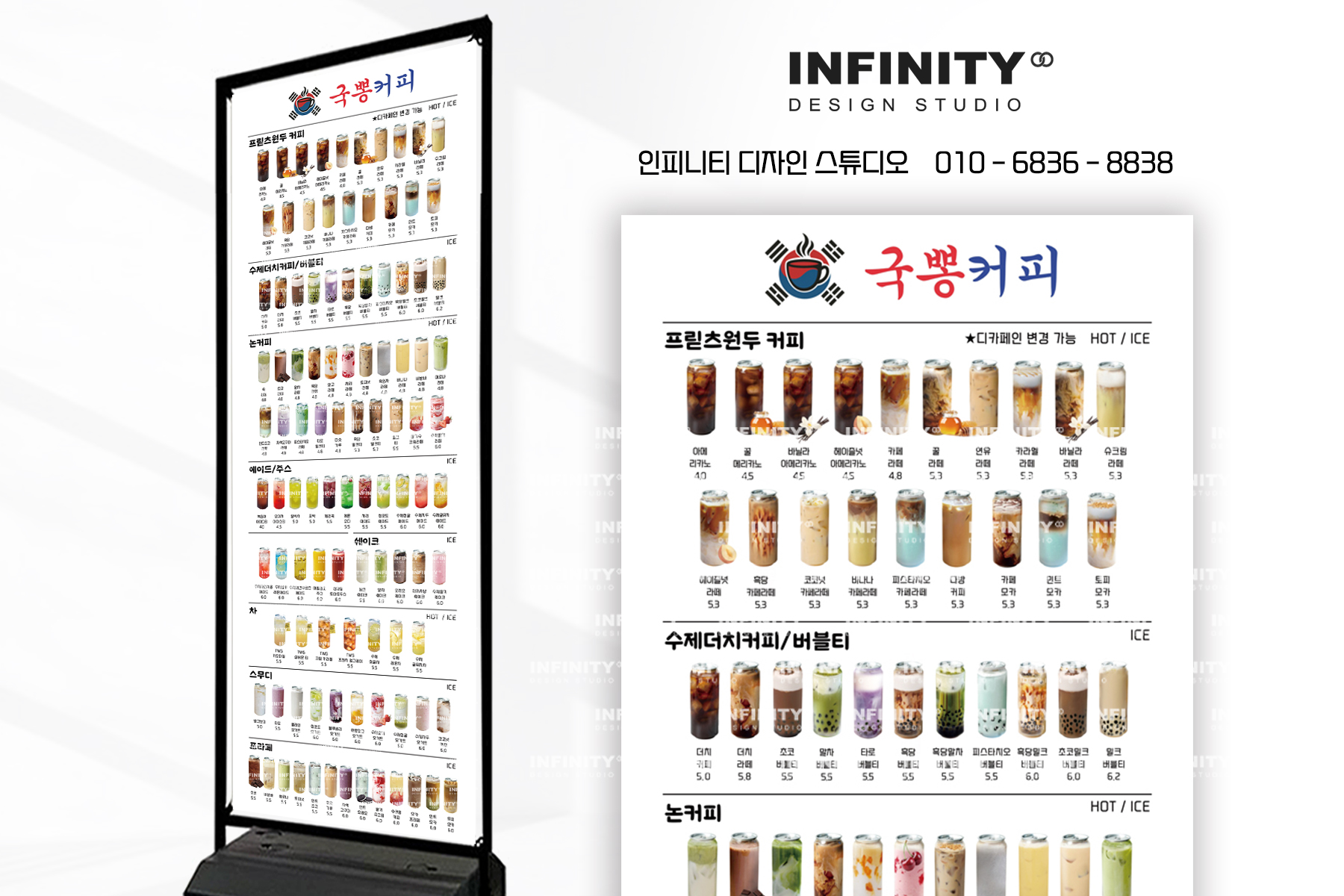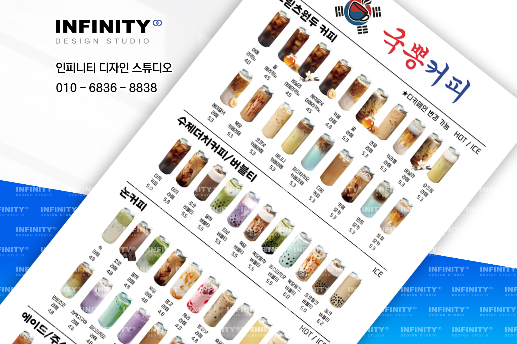 안녕하세요, 디자인, 제작 전문인피니티 디자인 스튜디오 입니다 :)오늘은 카페 배너와 포스터 제작 소식포스팅 준비했습니다 홍보하고 싶은 메뉴 구성으로 의뢰해주신카페 배너 + 포스터 세트