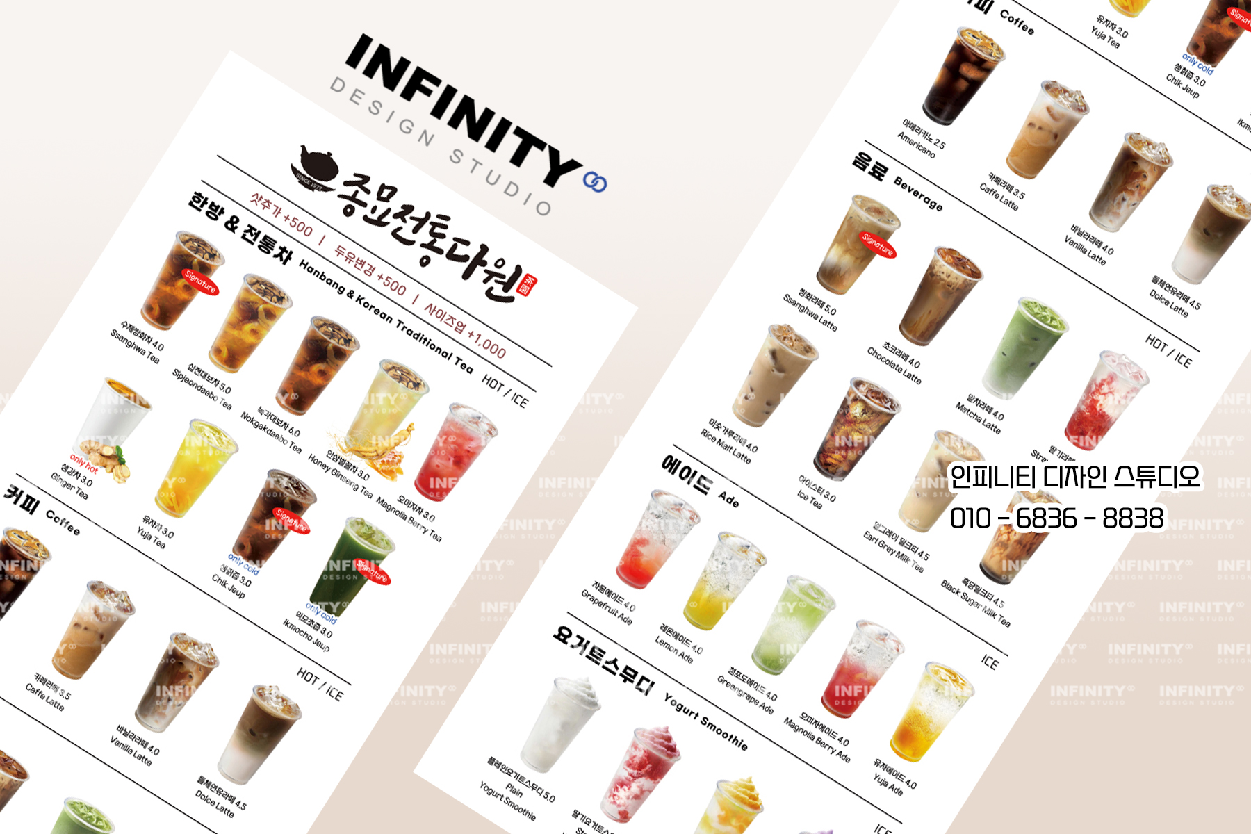 안녕하세요, 디자인, 제작 전문인피니티 디자인 스튜디오 입니다 :) 카페 시트지, 포스터, 배너 제작,카페 홍보물 디자인,카페 배너 메뉴판 디자인 카페오픈을 준비하며 의뢰해주신카페 홍보 시