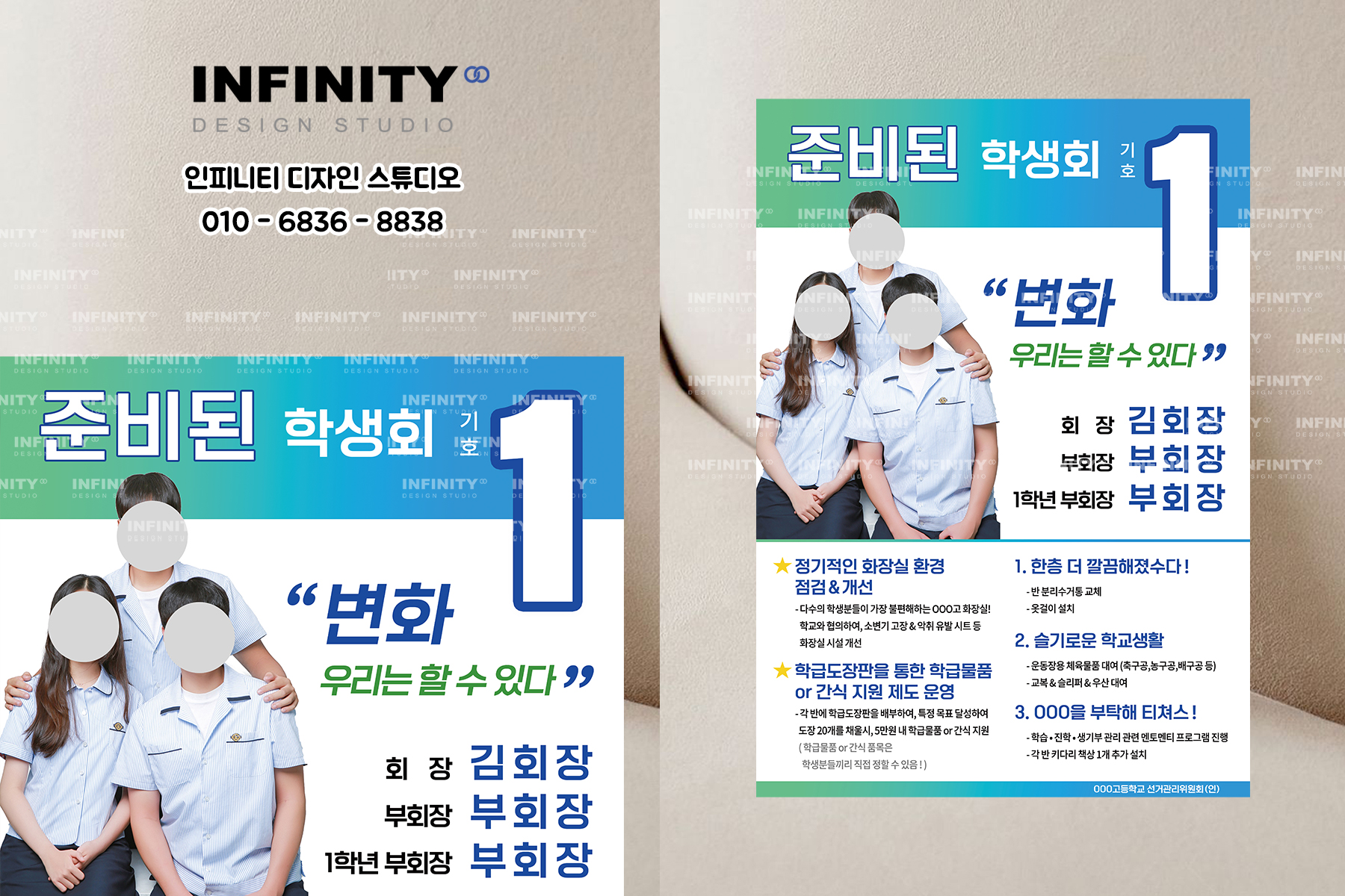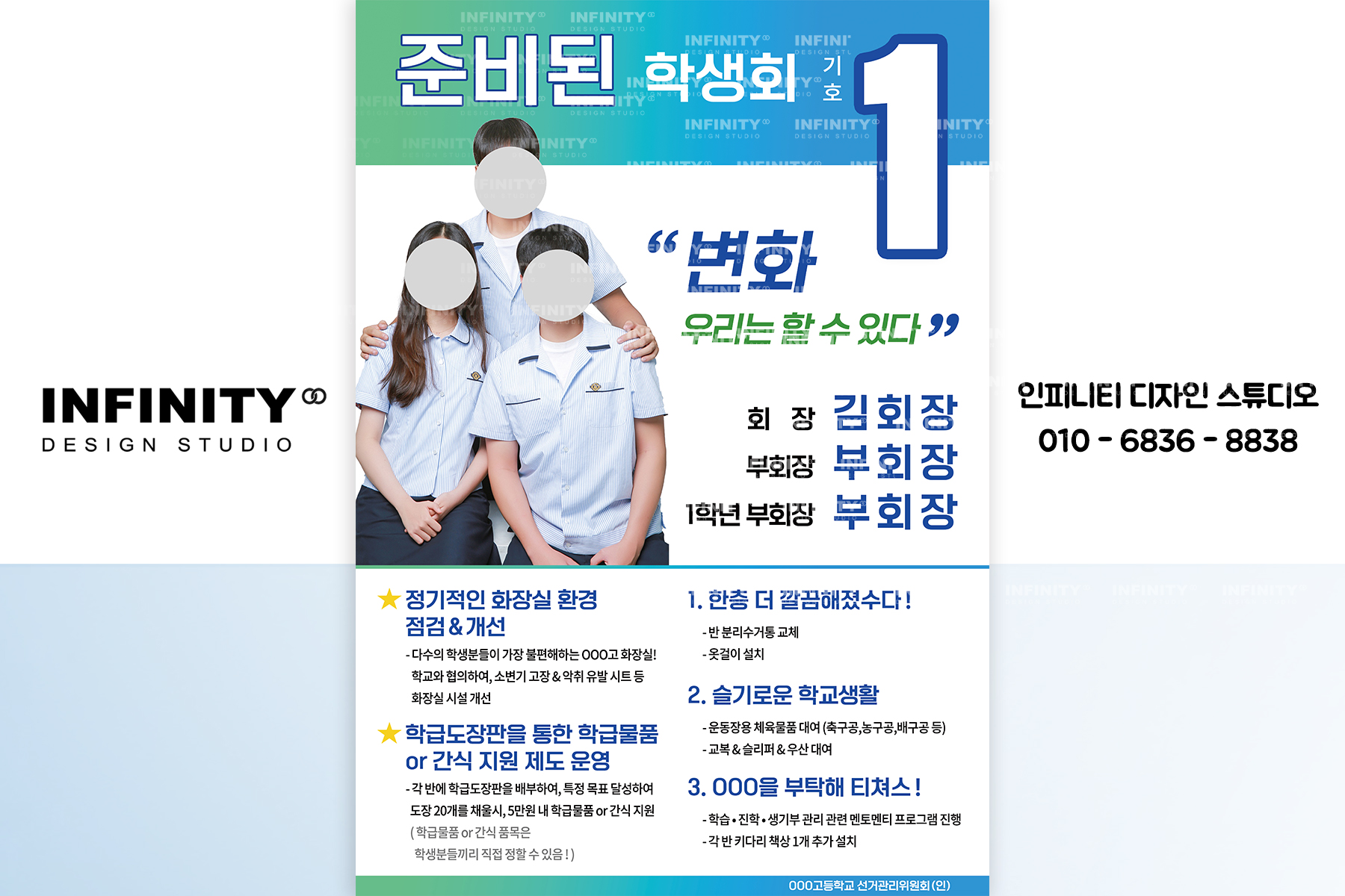 학생회 선거 시즌이 다가오면, 포스터 디자인은 후보의 이미지와 메시지를 효과적으로 전달하는 가장 중요한 도구입니다. 단순히 이름을 알리는 것을 넘어, 학생들에게 신뢰감과 친근감을 주는 브랜딩 요소로 활용할 수 있습니다. 인피니티 디자인 스튜디오에서는 미니멀하면서도 시선을 사로잡는 디자인을 제안합니다.