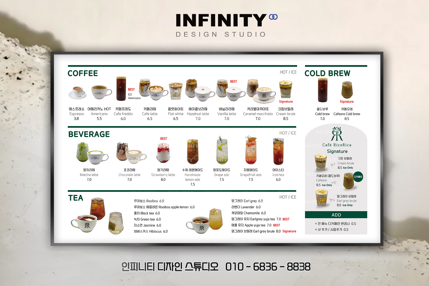 인피니티 디자인 스튜디오는 개인 카페뿐만 아니라 기업, 협회, 프랜차이즈 카페에도 인기 있는 디자인 서비스를 제공합니다.