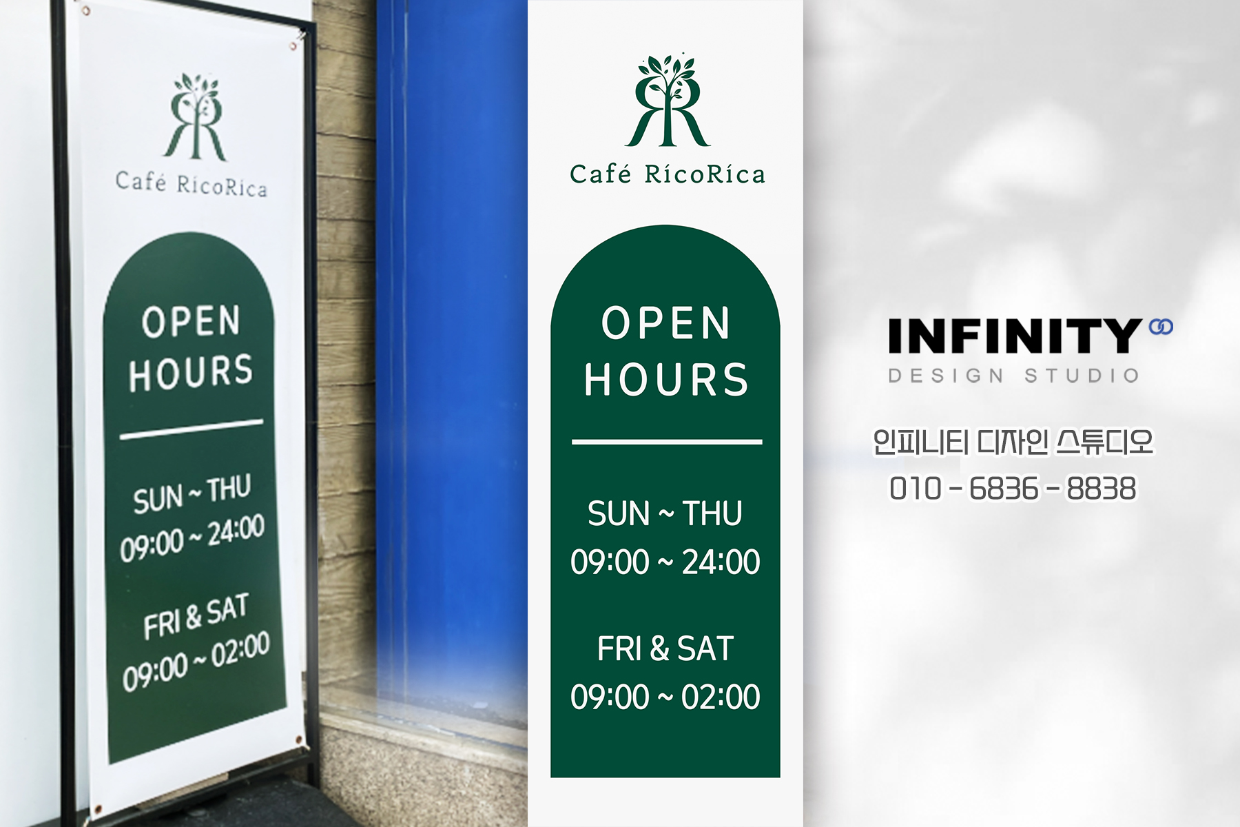 오픈 시간, 안내 내용 등을 담은 디자인으로 외부에 배치 가능합니다.